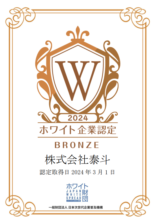 株式会社泰斗が、一般財団法人日本次世代企業普及機構(通称:ホワイト財団)が運営する「ホワイト企業認定 ブロンズランク」を取得したことをお知らせいたします。