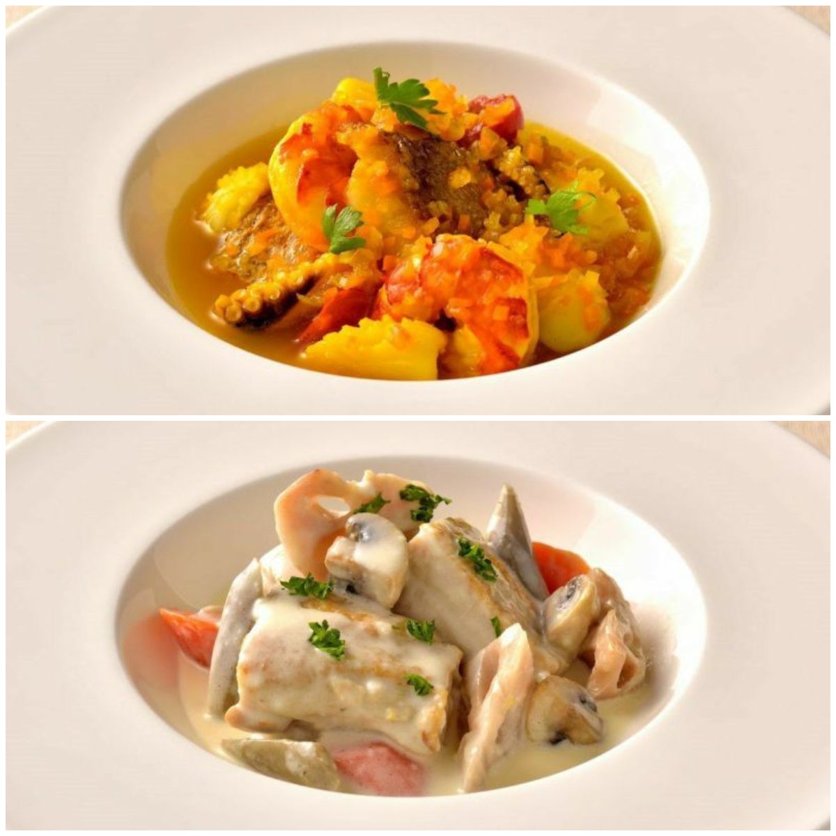 南フランスの名物料理ブイヤベースをホテルシェフがご家庭用にアレンジした「淡路島産真鯛のブイヤベース風」と、但馬どりのもも肉を根菜とともにじっくり煮込んだ「但馬どりと根菜のクリーム煮」のセット。魚介の旨みたっぷりのスープとまろやかでクリーミーな味わいをお愉しみください。