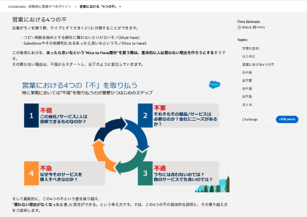 株式会社セールスフォース・ジャパン(本社:東京都千代田区、代表取締役会長 兼 社長:小出 伸一)は、本日、Sales Enablement(旧名称:myTrailhead)内で、営業スキル強化を中心とした社員育成のための学習コンテンツを順次無償で提供することを発表しました。