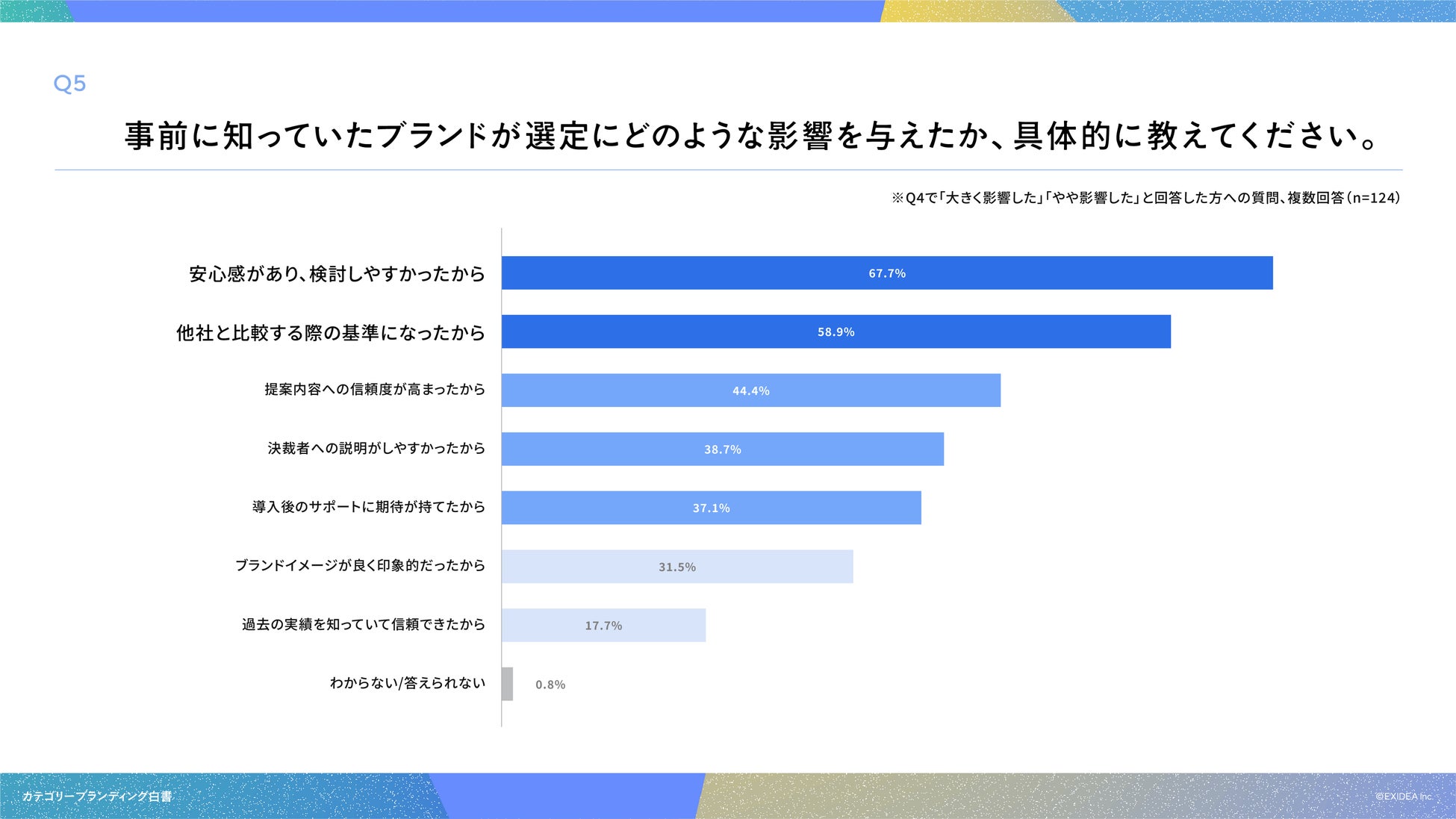 「Q5. Q4で「大きく影響した」「やや影響した」と回答した方にお聞きします。事前に知っていたブランドが選定にどのような影響を与えたか、具体的に教えてください。(複数回答)」(n=124)と質問したところ、「安心感があり、検討しやすかったから」が67.7%、「他社と比較する際の基準になったから」が58.9%、「提案内容への信頼度が高まったから」が44.4%という回答となりました。