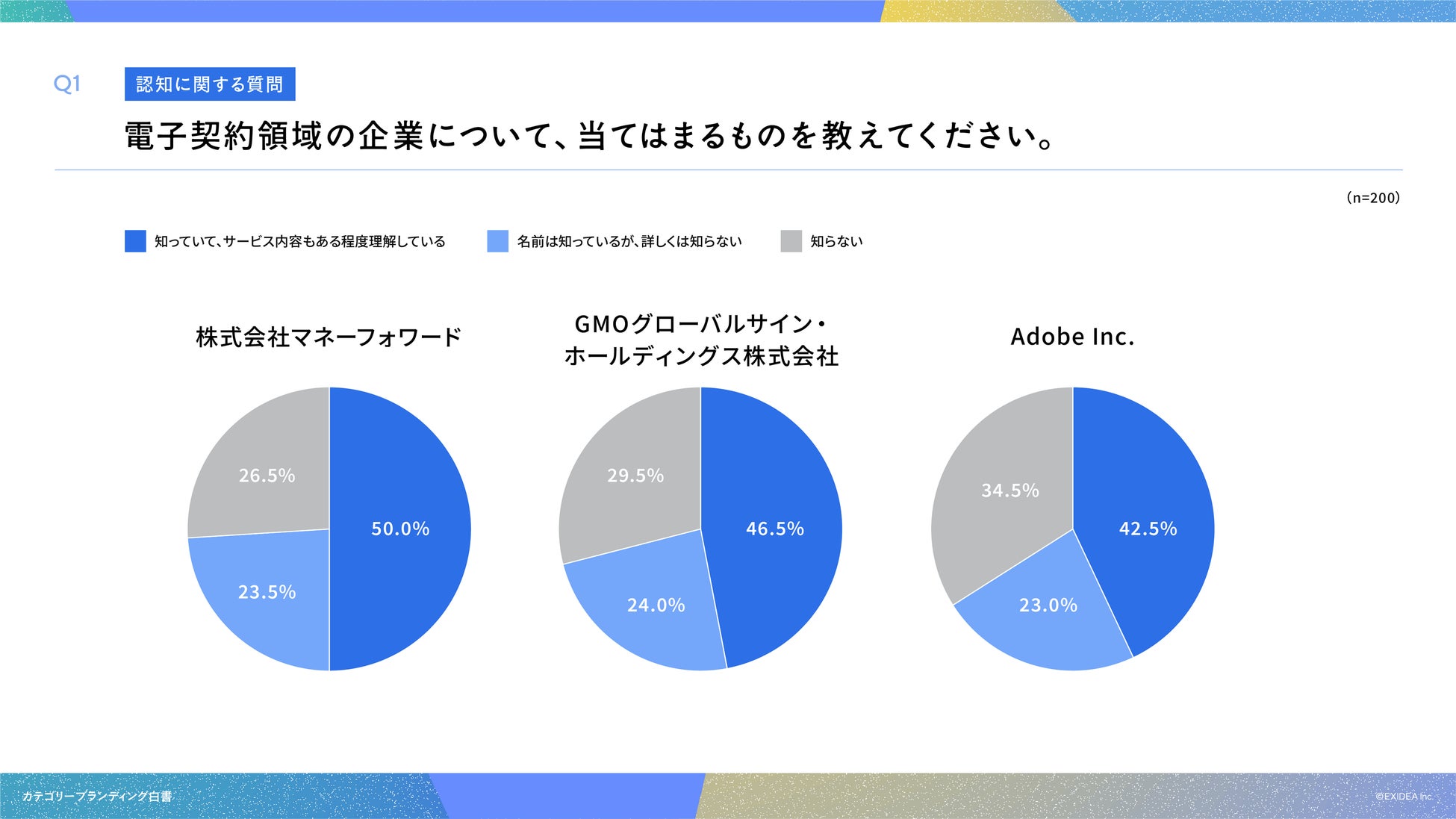 「Q1. 電子契約領域の企業について、当てはまるものを教えてください。」(n=200)と質問したところ、「知っていて、サービス内容もある程度理解している」と回答した割合は、株式会社マネーフォワードは50.0%、GMOグローバルサイン・ホールディングス株式会社が46.5%、Adobe Inc.が42.5%となりました。