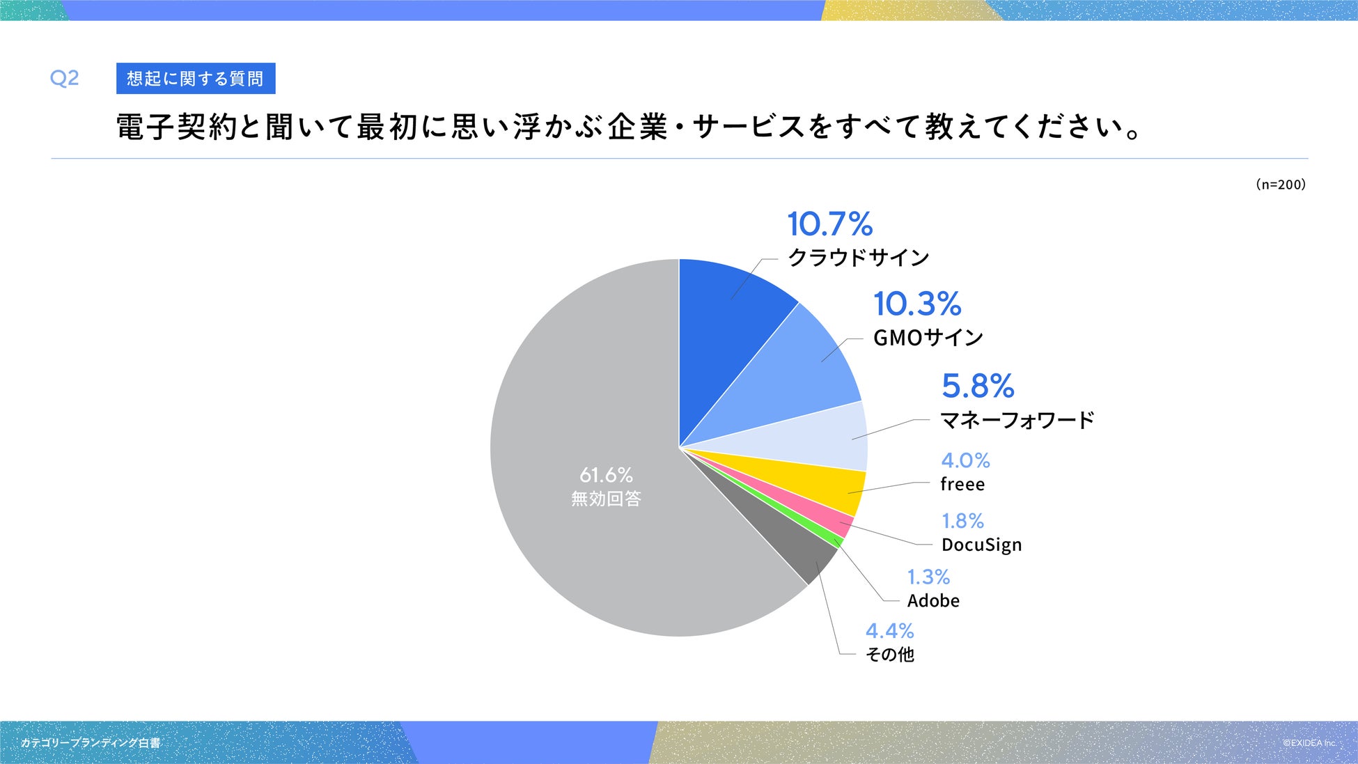 「Q2. 電子契約と聞いて最初に思い浮かぶ企業・サービスをすべて教えてください。(自由回答)」(n=200)と質問したところ、「クラウドサイン」が10.7%、「GMOサイン」が10.3%、「マネーフォワード」が5.8%という回答となりました。