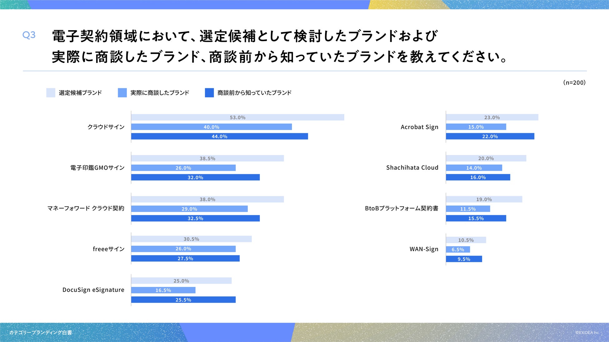 「Q3. 電子契約領域において、選定候補として検討したブランドおよび実際に商談したブランド、商談前から知っていたブランドを教えてください。」(n=200)と質問したところ、選定候補ブランドは「クラウドサイン」が53.0%、実際に商談したブランドは「クラウドサイン」が40.0%、商談前から知っていたブランドは「クラウドサイン」が44.0%という回答となりました。