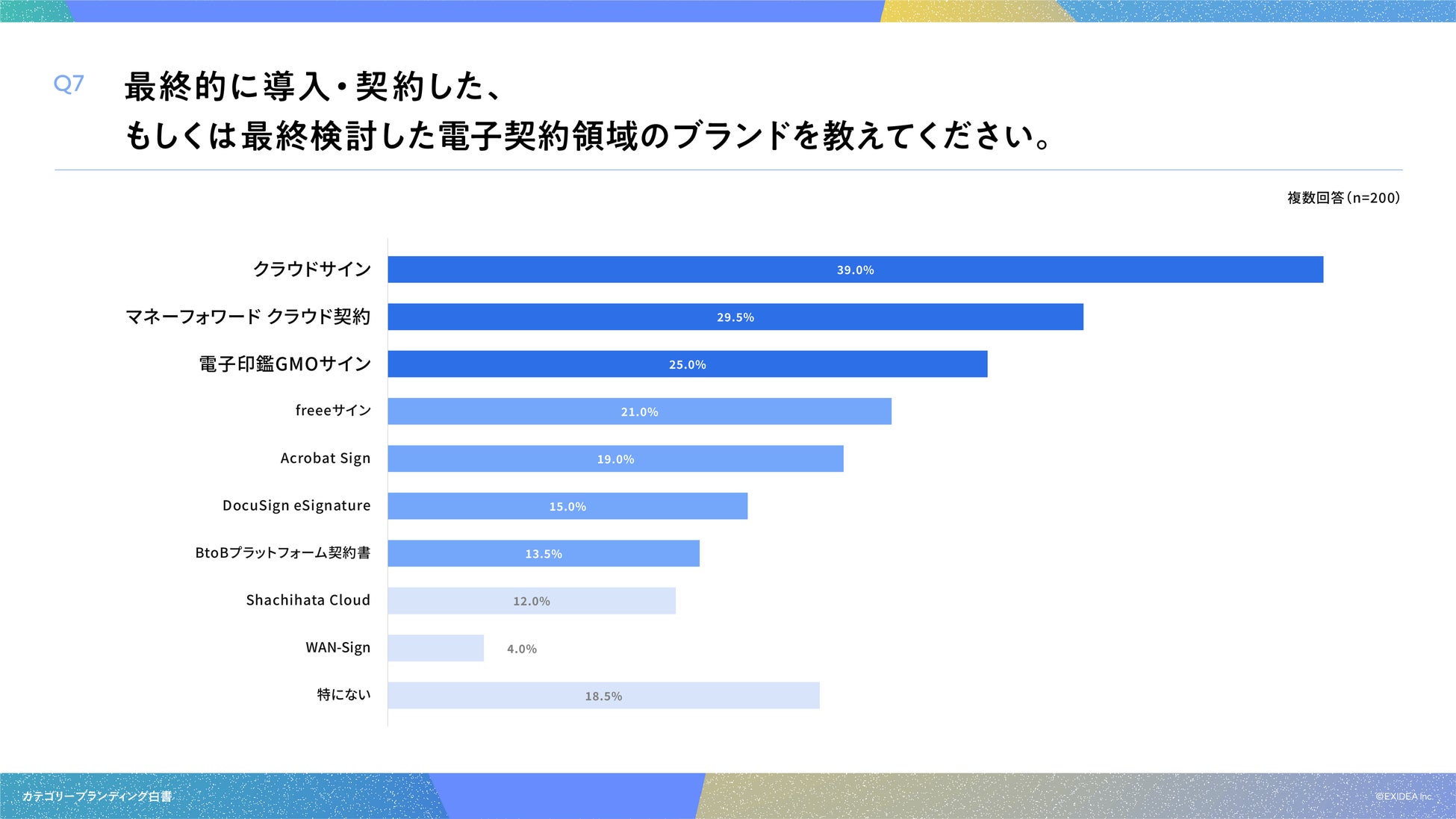 「Q7. 最終的に導入・契約した、もしくは最終検討した電子契約領域のブランドを教えてください。(複数回答)」(n=200)と質問したところ、「クラウドサイン」が39.0%、「マネーフォワード クラウド契約」が29.5%、「電子印鑑GMOサイン」が25.0%という回答となりました。