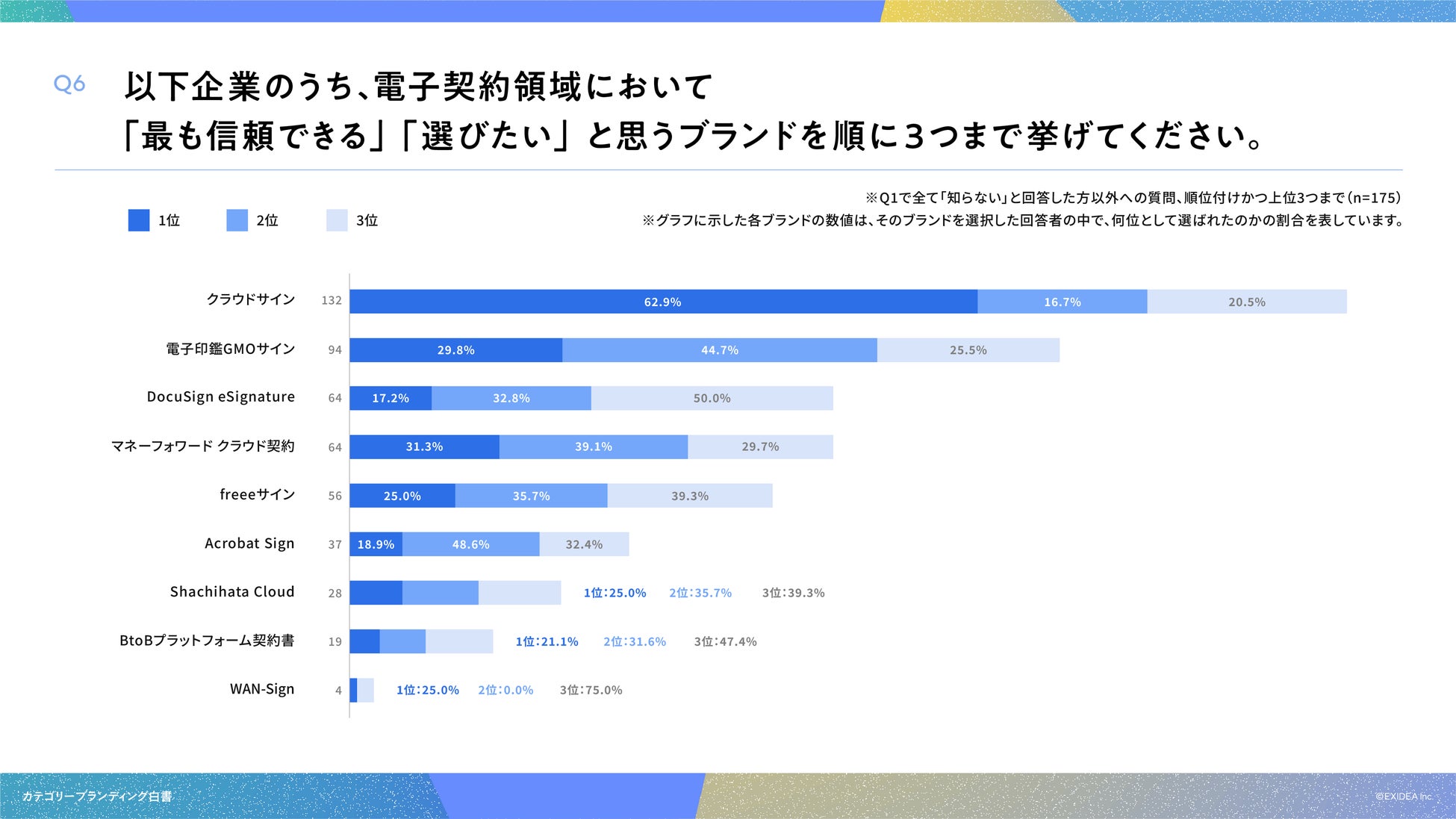 「Q6. Q1で全て「知らない」以外を回答した方にお聞きします。以下企業のうち、電子契約領域において「最も信頼できる」「選びたい」と思うブランドを順に3つまで挙げてください(順位付けかつ上位3つまで)」(n=175)と質問したところ、1位に選出された割合の「1位率」は、選出数が多い順にクラウドサインが62.9%、電子印鑑GMOサインが29.8%、DocuSign eSignatureが17.2%、マネーフォワード クラウド契約が31.3%、という回答となりました。