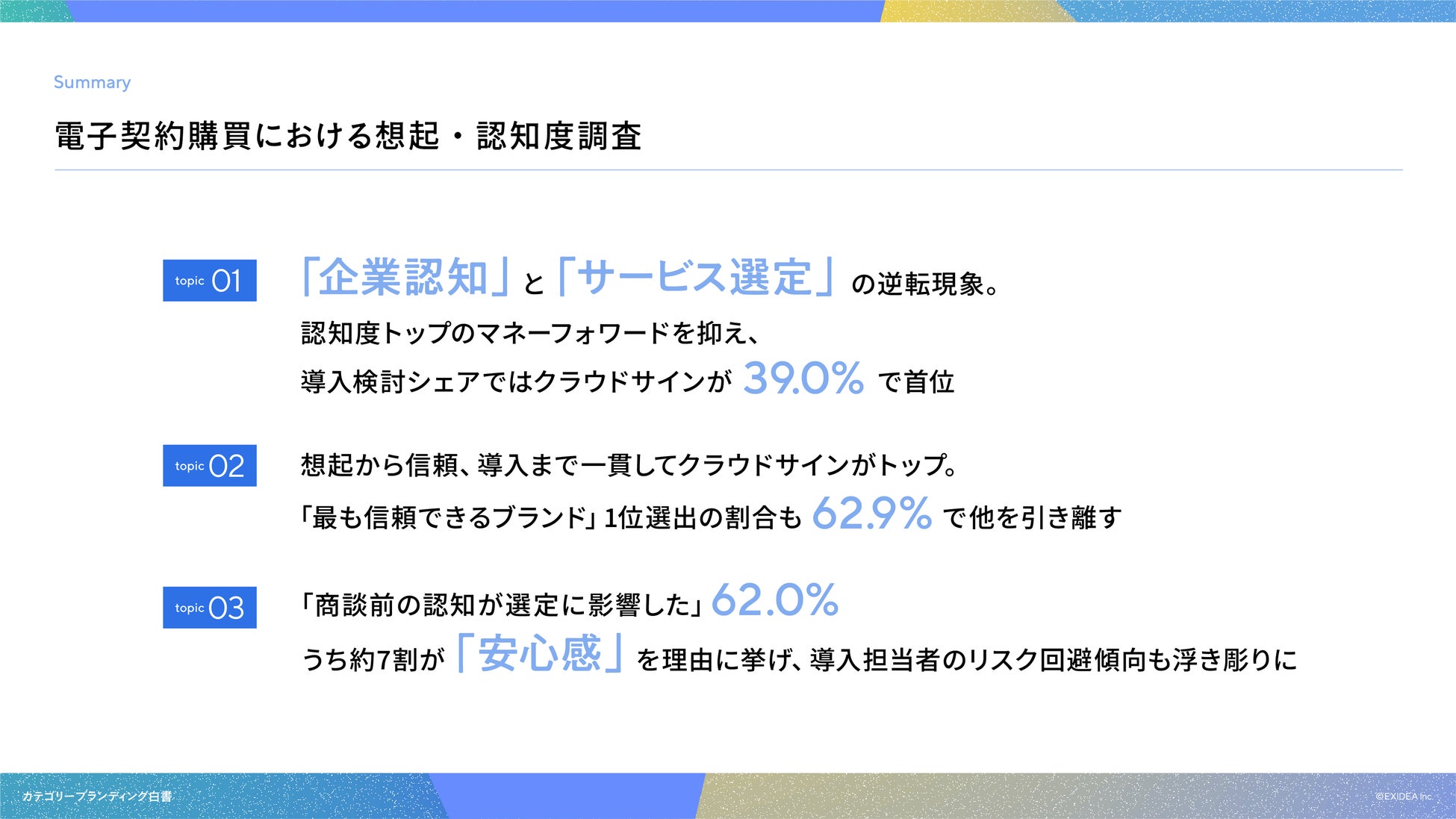 【カテゴリーブランディング白書 vol.10】カテゴリーの代名詞となり企業認知度の差を覆す。電子契約領域の企業認知度1位はマネーフォワードも、想起から導入検討シェアの全指標でクラウドサインが首位に。