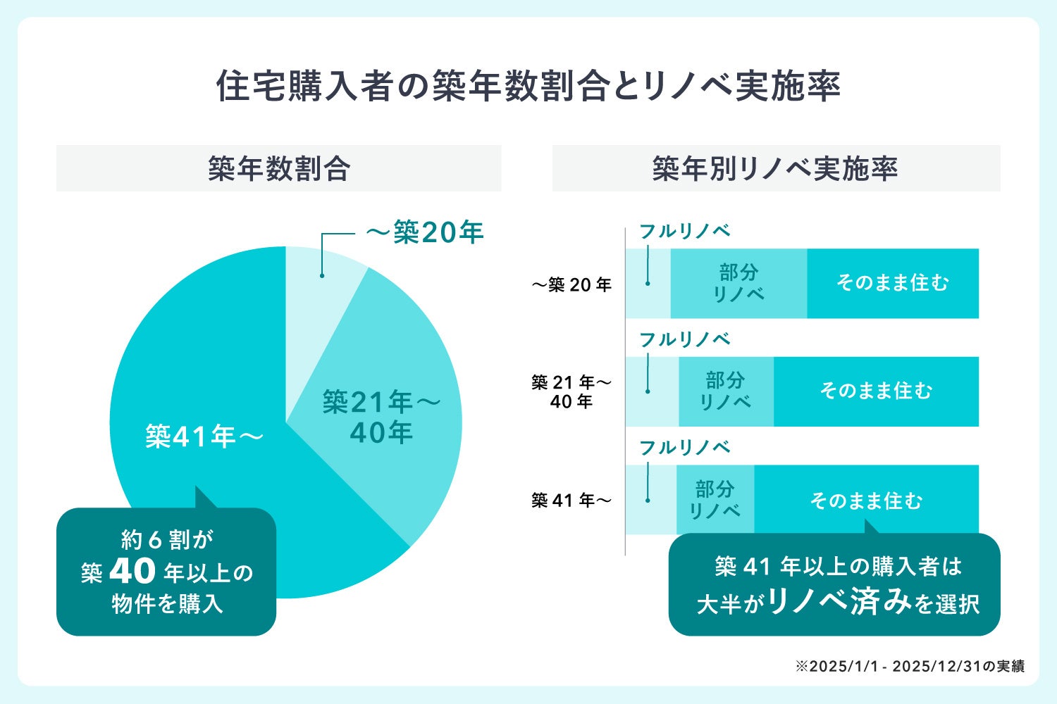 成約物件の6割以上が築40年超。かつては築古は大規模な修繕やフルリノベーションが不可欠というイメージでしたが、現在はリノベーション済み物件の普及により、築古でもそのまま住める物件が増加。立地や広さ、管理体制といったそれぞれの重視したい条件を優先する住まい探しがスタンダードになっていると読み取れます。