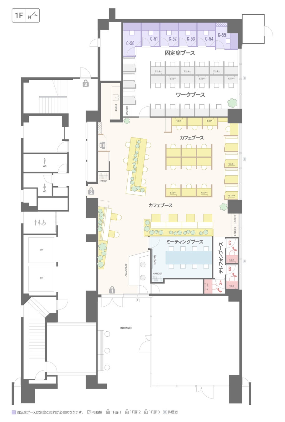設備:Wi-Fi、フリードリンク、無料プリンター、ロッカー、ポスト、登記可、会議室、WEB会議用個室、コンシェルジュ