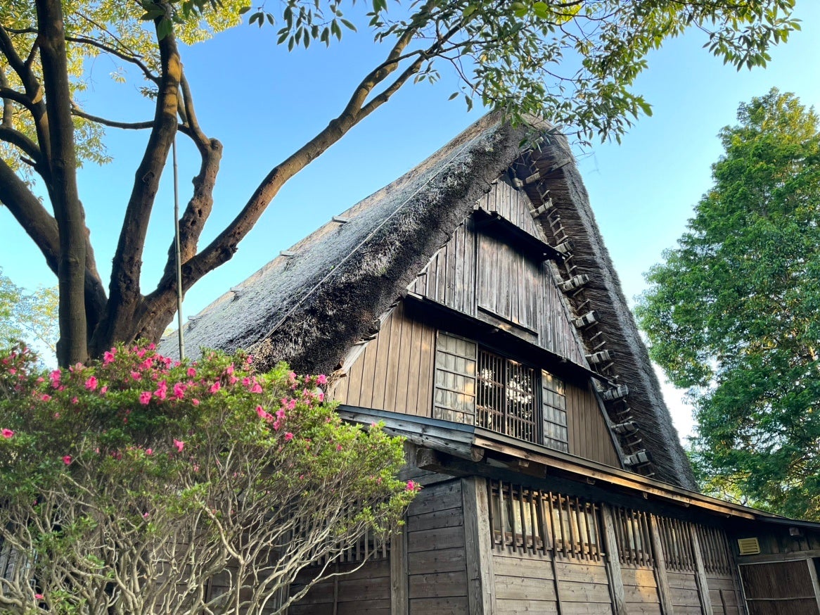 白川郷から昭和30年に移築された合掌造りの建物が園内の中央にあり、建物内では囲炉裏もあり当時の生活の様子を感じられます。天井裏に繋がる階段を上ると合掌造りならではの構造を間近に見ることも出来ます。