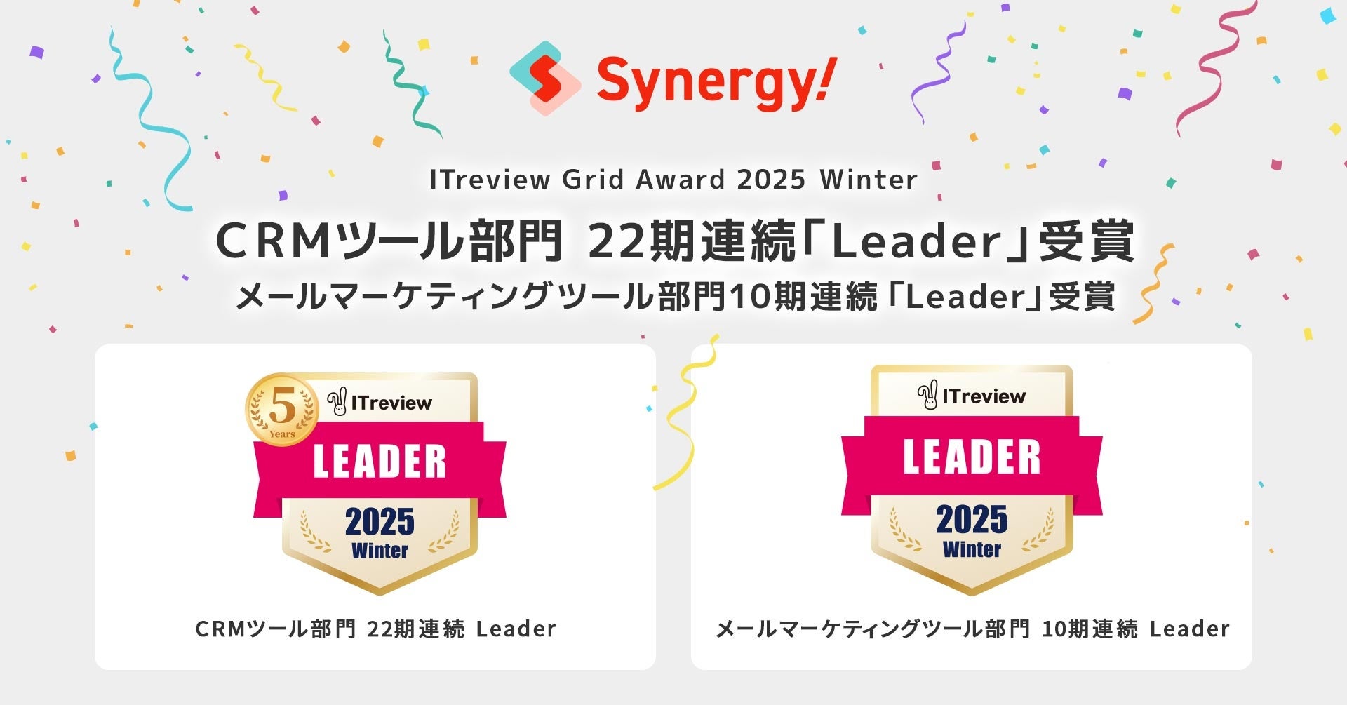 シナジーマーケティング株式会社(以下当社)は、当社が提供するクラウド型システム「Synergy!(シナジー)」がアイティクラウド株式会社(本社:東京都港区、代表取締役社長:黒野源太)運営のIT製品レビュープラットフォーム「ITreview(アイティレビュー)」において、満足度、認知度ともに優れた製品であると評価され「ITreview Grid Award 2025 Winter」CRMツールおよびメールマーケティングツール部門において最高位「Leader」を受賞したことをお知らせします。CRMツール部門における「Leader」受賞は22期連続、メールマーケティング部門では10期連続となります。
