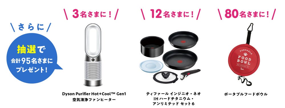 本キャンペーンは、期間中にペット保険にお申込みいただいたご成約者さま全員に、「ミスタードーナツ ギフトチケット(300円)」をプレゼントします。さらに抽選で合計95名さまに、1台3役の空気清浄ファンヒーターや人気の調理器具、持ち運びに便利で防災グッズにもなるポータブルフードボウルが当たります。