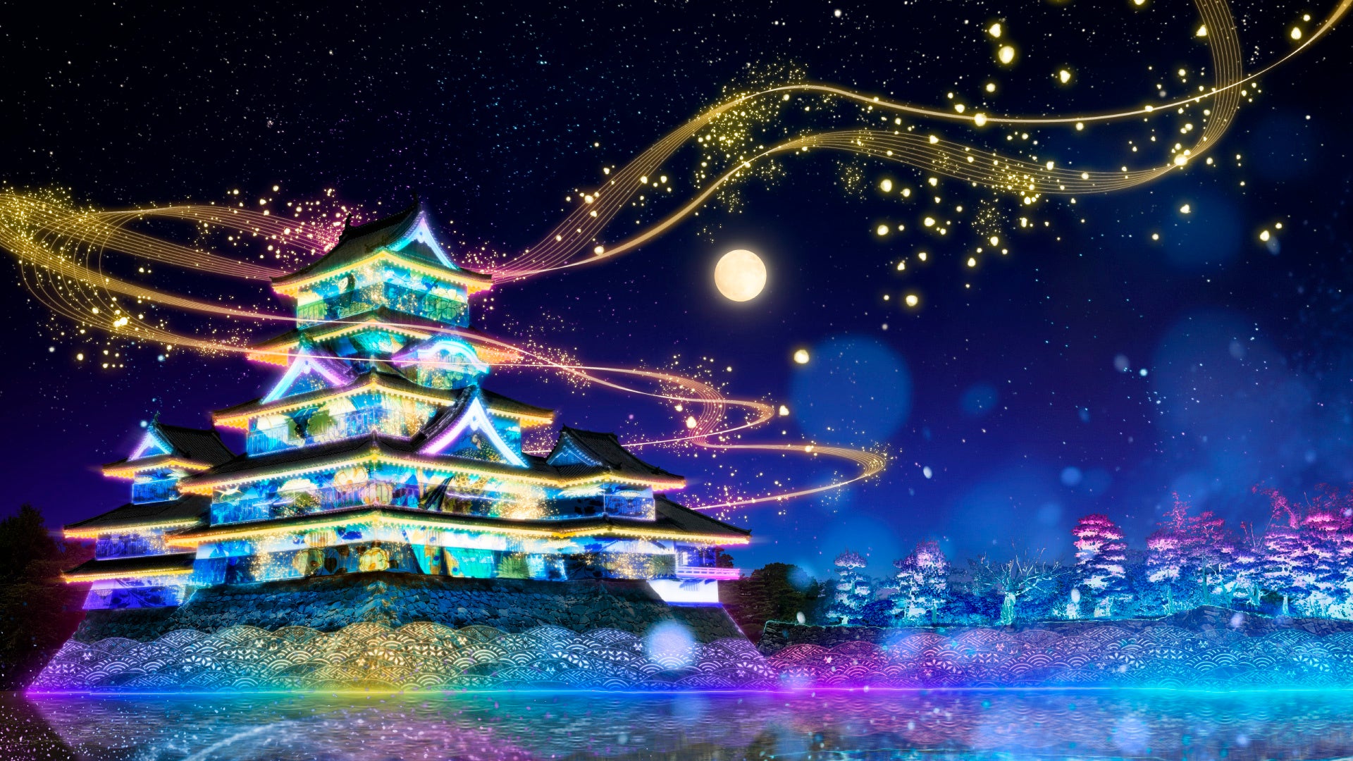【内容】 現存国宝5天守の一つで五重六階の天守の中で最古の国宝 松本城の天守や石垣などに、豪壮な天守を築いた城主・石川数正が描かれた屏風絵が躍動するデジタルアニメーションや雪の結晶や氷などをモチーフとしたデジタルアート、北アルプスに美しく咲き誇る百花繚乱の花々など、ダイナミックで幻想的なプロジェクションマッピング映像を投影します。