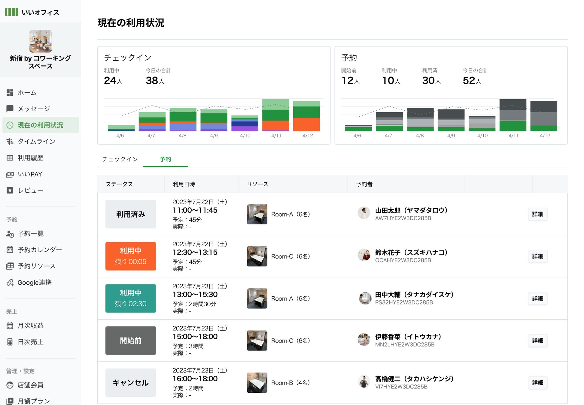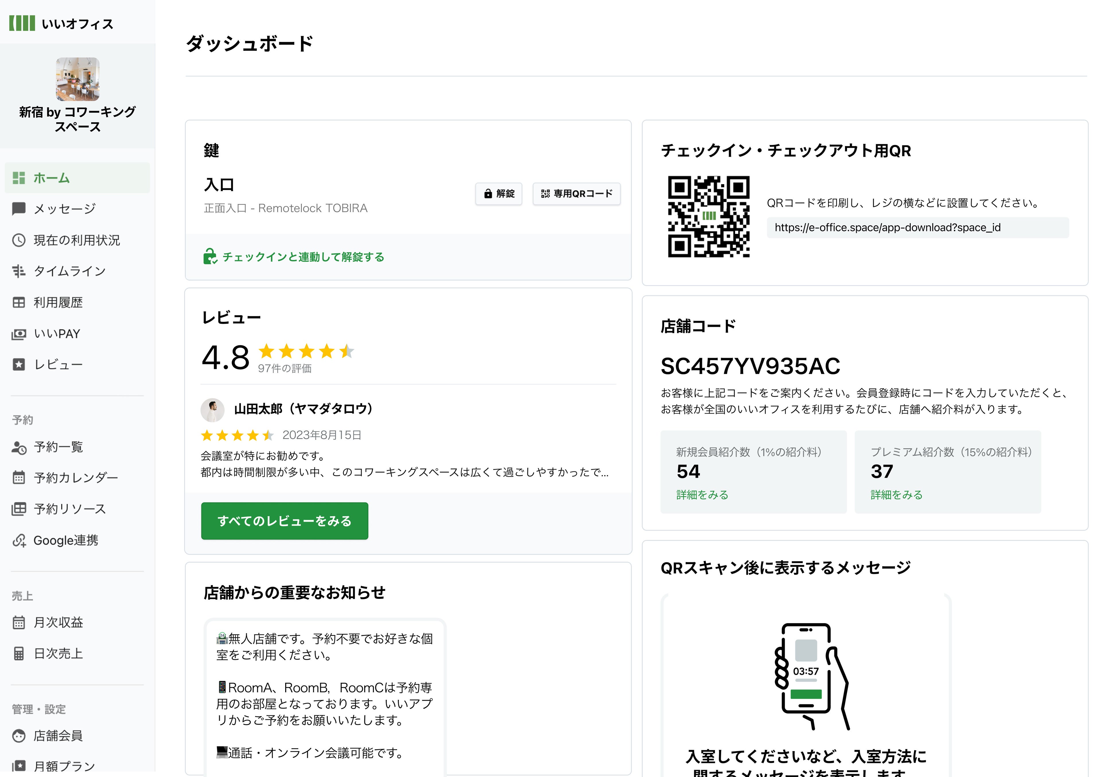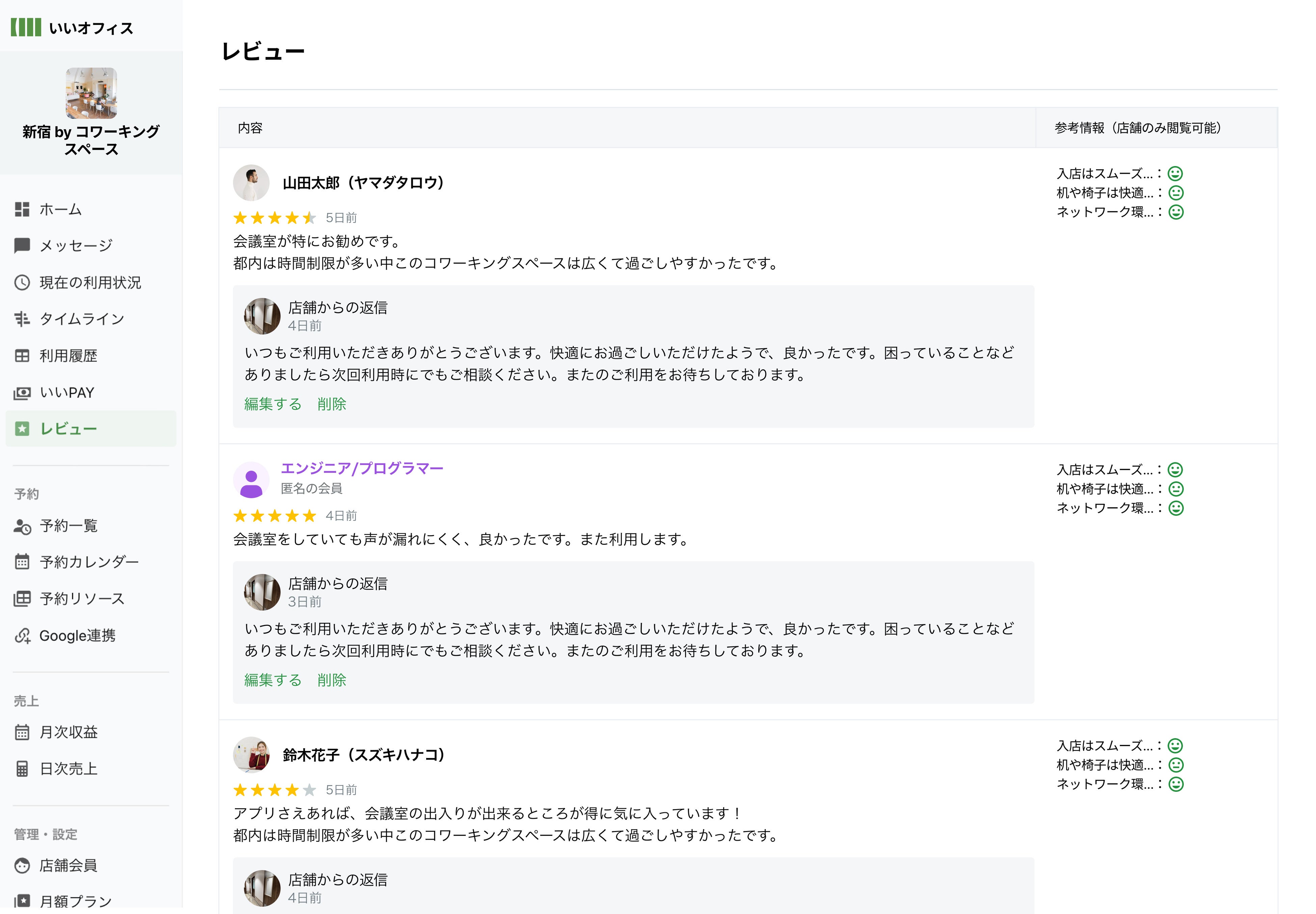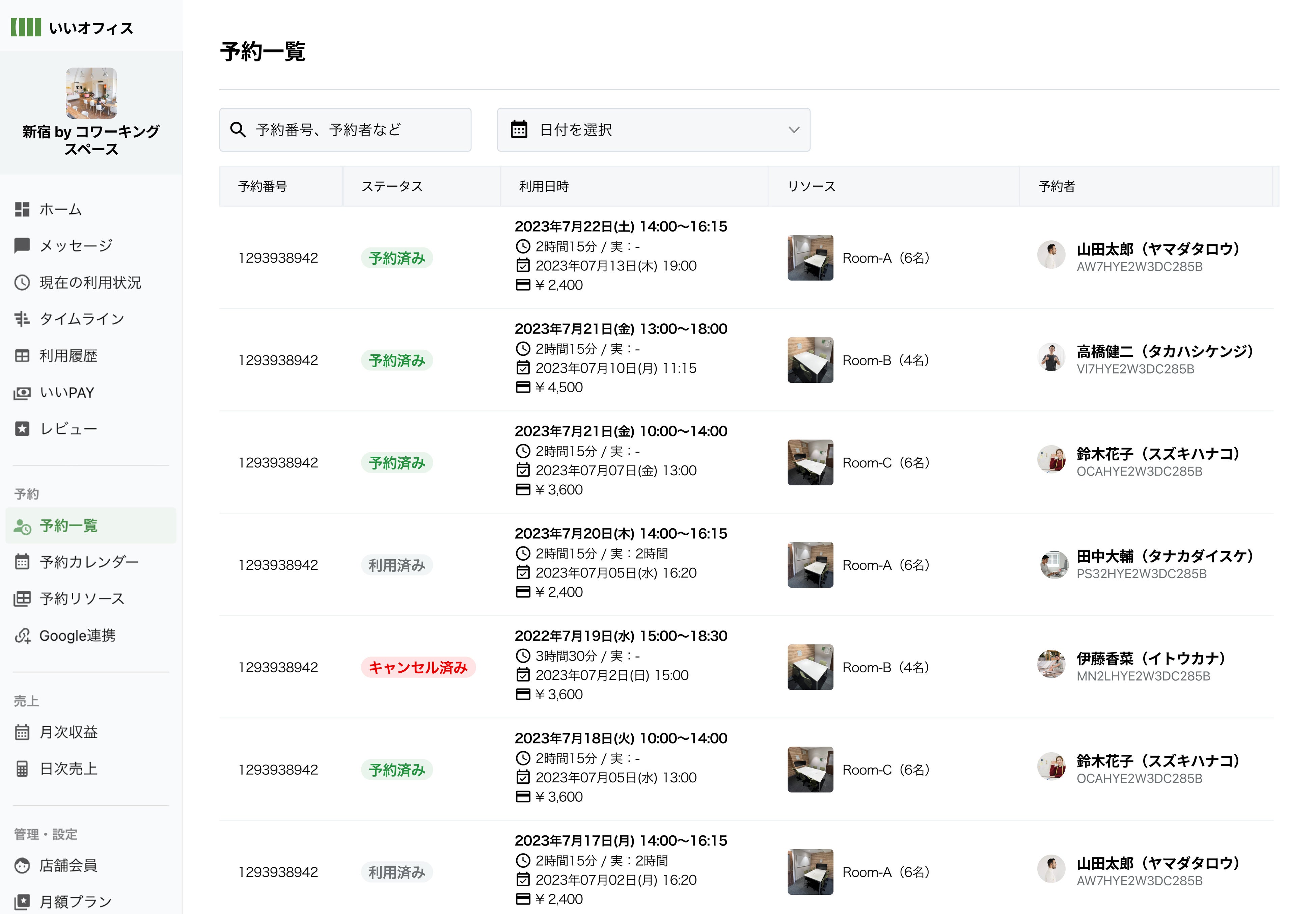 ワークスペースの運営を8年以上続けてきたからこそ分かる、会議室運営に必要な機能を揃えた管理システムを開発。会員様ごとの利用履歴、会議室や個室の予約管理、売上分析、レビュー管理など、円滑な運営に必要な機能をご用意しています。