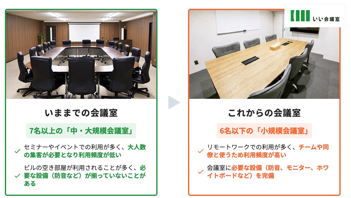 当社はこのようなニーズに応えるべく、ビジネス利用に特化した少人数向け貸会議室サービス「いい会議室」の提供を開始しました。