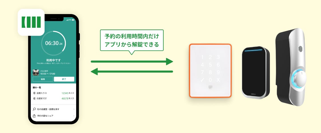 「いい会議室」は自社開発したシステムで、無人運営が可能な仕組みでご提供します。ご利用者様は利用開始時間に来店して、店頭に掲示してあるQRコードを読み取って、スマートロックを解錠。予約と同時に決済も完了するため、予約から利用終了まで無人で対応可能です。
