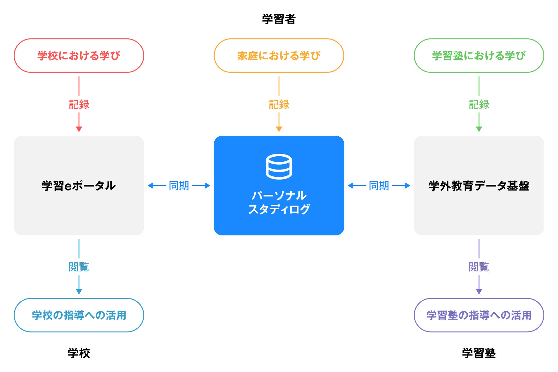 家庭・学校・学習塾における学習者のあらゆる学びの記録を「パーソナルスタディログ」として一元化・可視化することによって、学校・学習塾の先生はそれぞれのカリキュラムを越えて、一人ひとりの考えや悩みに寄り添った指導ができるようになり、学習者に個別最適な学びを提供できるようになります。