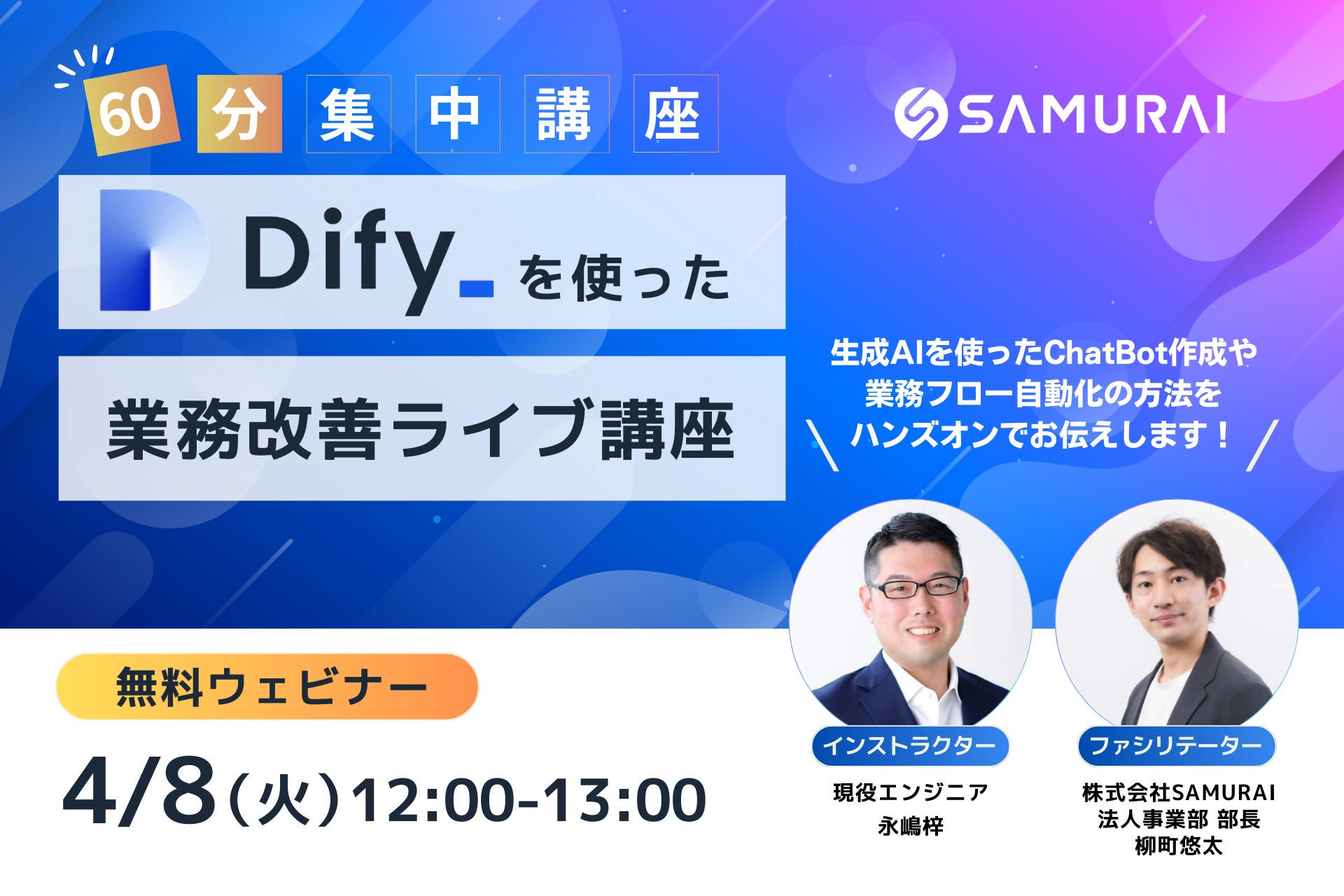 プログラミングスクール「侍エンジニア」を運営する株式会社SAMURAIは、60分で生成AI×プログラミングの可能性を体感できる『Difyを使った業務改善ライブ講座』を4/8(火)に無料で開講いたします。現役エンジニアによるライブコーディング型の講座ですので、初心者・未経験の方でも安心してご参加いただけます。