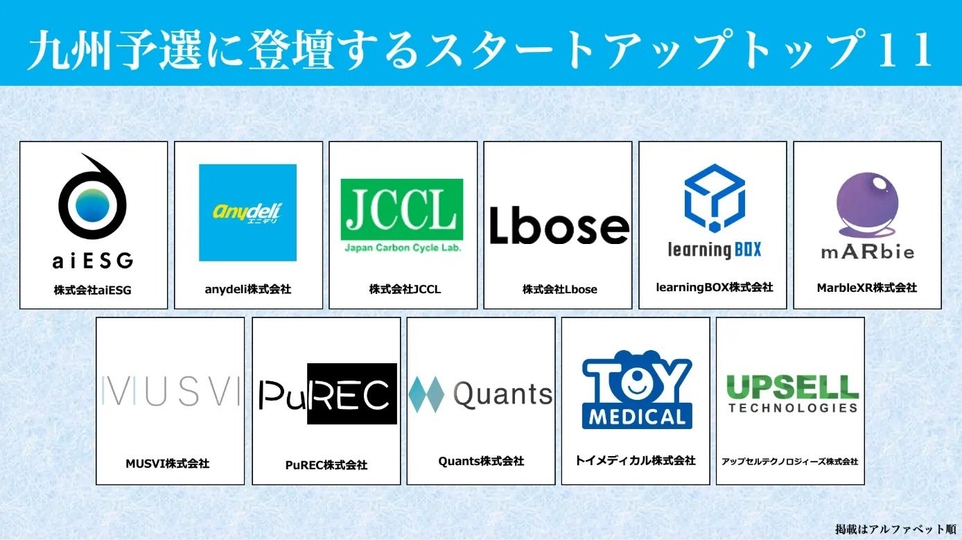 九州からは、株式会社aiESG(福岡県)、株式会社JCCL(福岡県)、株式会社Lbose(熊本県)、MarbleXR株式会社(福岡県)、トイメディカル株式会社(熊本県)の5社が登壇いたします。