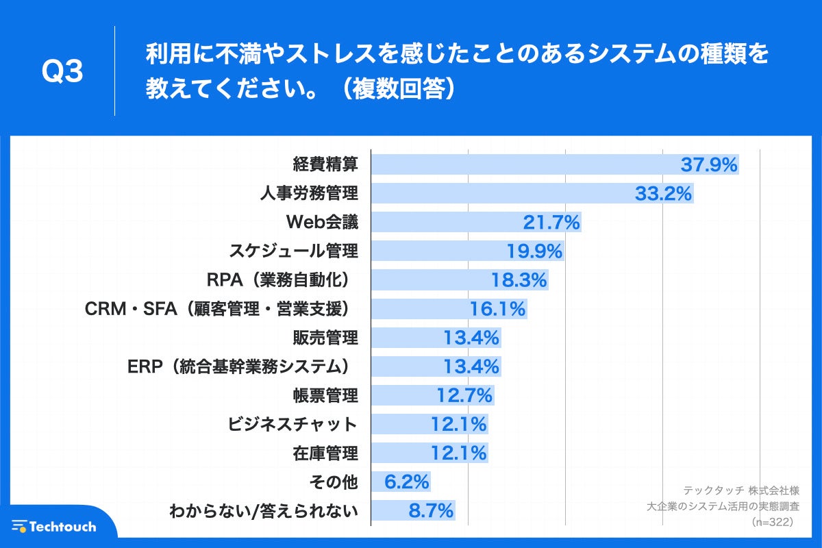 Q1で「何度もある」「数回程度ある」と回答した方に、「Q3.利用に不満やストレスを感じたことのあるシステムの種類を教えてください。(複数回答)」(n=322)と質問したところ、「経費精算」が37.9%、「人事労務管理」が33.2%、「Web会議」が21.7%という回答となりました。