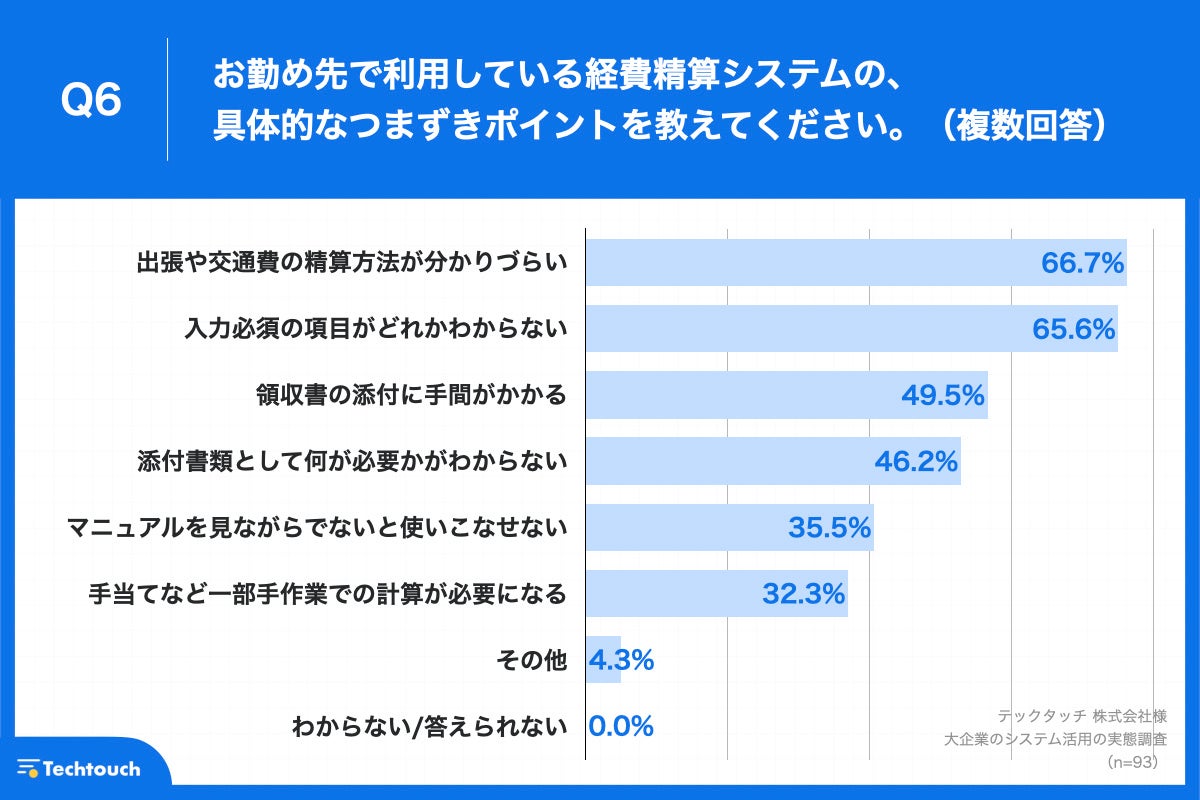 Q5で「経費精算」と回答した方に、「Q6.お勤め先で利用している経費精算システムの、具体的なつまずきポイントを教えてください。(複数回答)」(n=93)と質問したところ、「出張や交通費の精算方法が分かりづらい」が66.7%、「入力必須の項目がどれかわからない」が65.6%、「領収書の添付に手間がかかる」が49.5%という回答となりました。