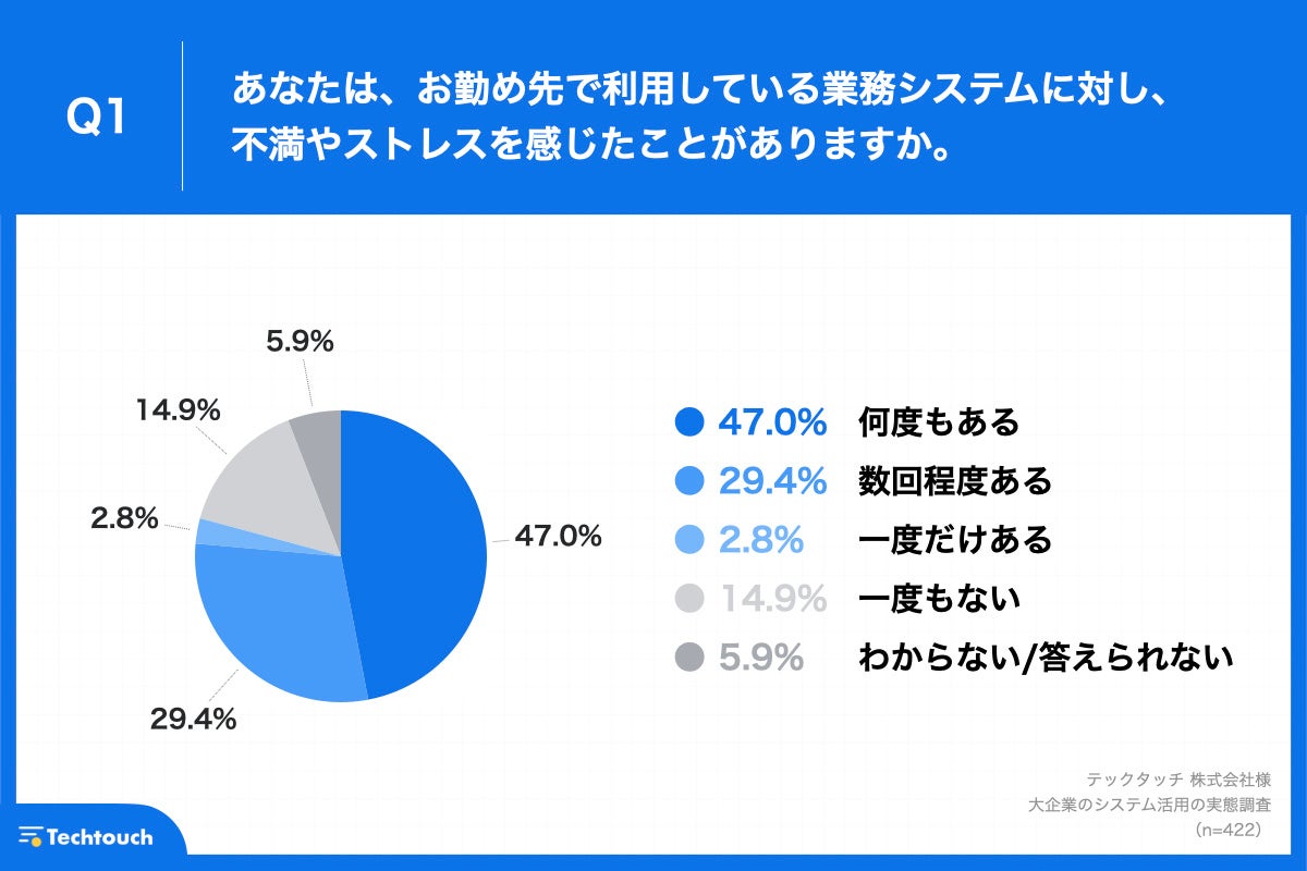 「Q1.あなたは、お勤め先で利用している業務システムに対し、不満やストレスを感じたことがありますか。」(n=422)と質問したところ、「何度もある」が47.0%、「数回程度ある」が29.4%という回答となりました。
