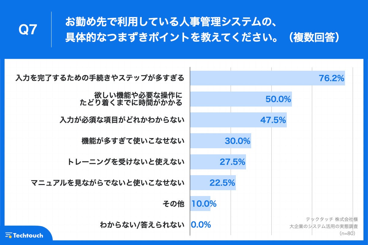 Q5で「人事労務管理」と回答した方に、「Q7.お勤め先で利用している人事管理システムの、具体的なつまずきポイントを教えてください。(複数回答)」(n=80)と質問したところ、「入力を完了するための手続きやステップが多すぎる」が76.2%、「欲しい機能や必要な操作にたどり着くまでに時間がかかる」が50.0%、「入力が必須な項目がどれかわからない」が47.5%という回答となりました。