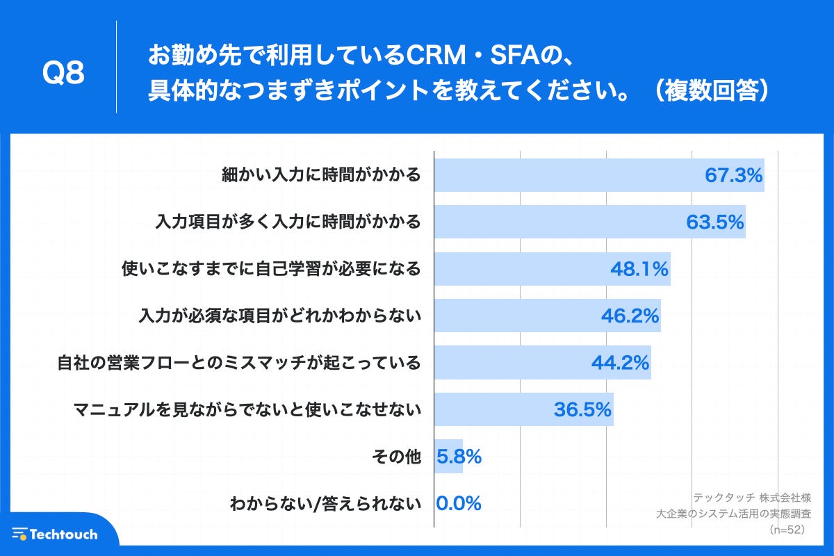 Q5で「CRM・SFA」と回答した方に、「Q8.お勤め先で利用しているCRM・SFAの、具体的なつまずきポイントを教えてください。(複数回答)」(n=52)と質問したところ、「細かい入力に時間がかかる」が67.3%、「入力項目が多く入力に時間がかかる」が63.5%、「使いこなすまでに自己学習が必要になる」が48.1%という回答となりました。