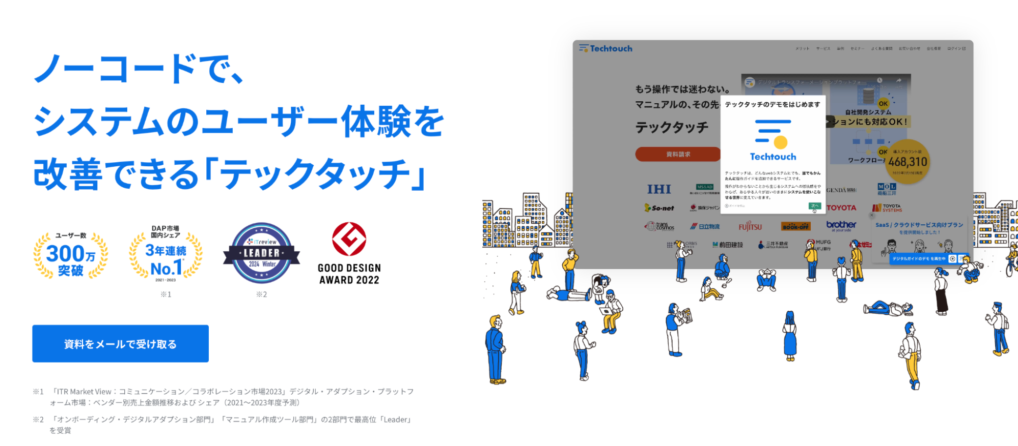 テックタッチは「すべてのユーザーがシステムを使いこなせる世界に」をミッションに掲げるデジタルアダプションツールを開発・提供する企業です。あらゆるWebシステムの入力をアシストするDXプラットフォーム「テックタッチ」を提供しています。大手企業や自治体・官公庁から、カスタマーサクセス部門を強化するクラウドサービス提供企業まで幅広く導入され、ユーザー数は300万人超。これまでグッドデザイン賞などを多数受賞し、2023年には経済産業省が選ぶJ-Startupにも認定されました。国内シェアNo.1の「テックタッチ」を通じ、日本のDX推進を後押ししていきます。