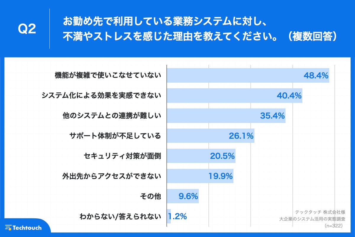 Q1で「何度もある」「数回程度ある」と回答した方に、「Q2.お勤め先で利用している業務システムに対し、不満やストレスを感じた理由を教えてください。(複数回答)」(n=322)と質問したところ、「機能が複雑で使いこなせていない」が48.4%、「システム化による効果を実感できない」が40.4%、「他のシステムとの連携が難しい」が35.4%という回答となりました。