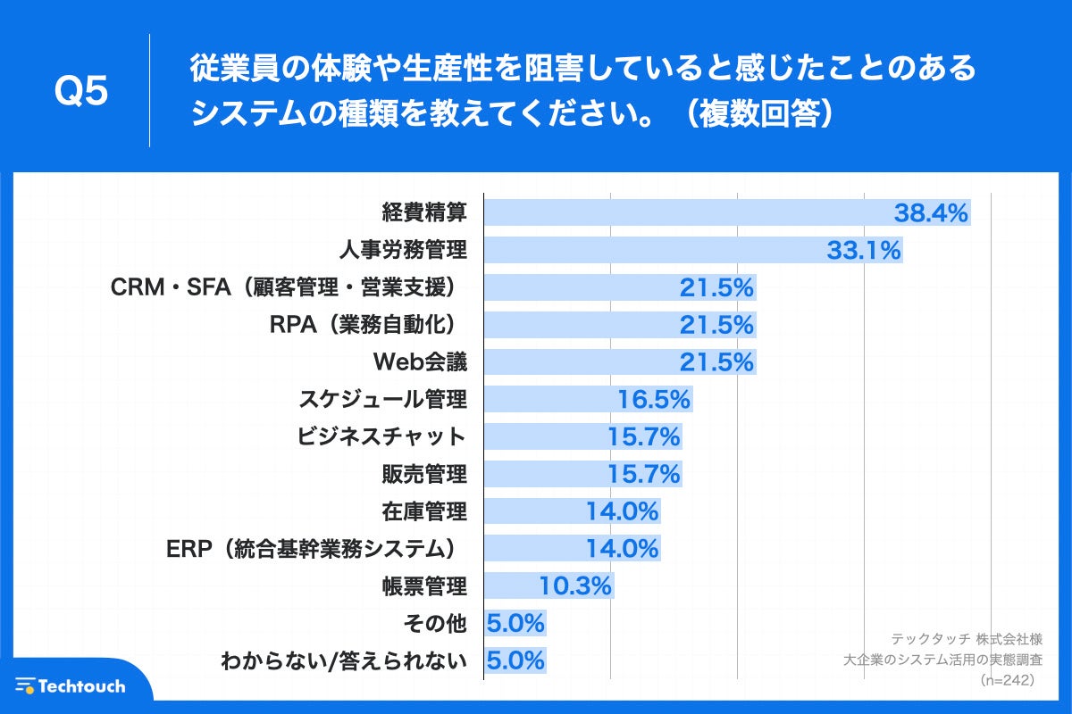 Q4で「何度もある」「数回程度ある」と回答した方に、「Q5.従業員の体験や生産性を阻害していると感じたことのあるシステムの種類を教えてください。(複数回答)」(n=242)と質問したところ、「経費精算」が38.4%、「人事労務管理」が33.1%、「CRM・SFA(顧客管理・営業支援)」が21.5%という回答となりました。