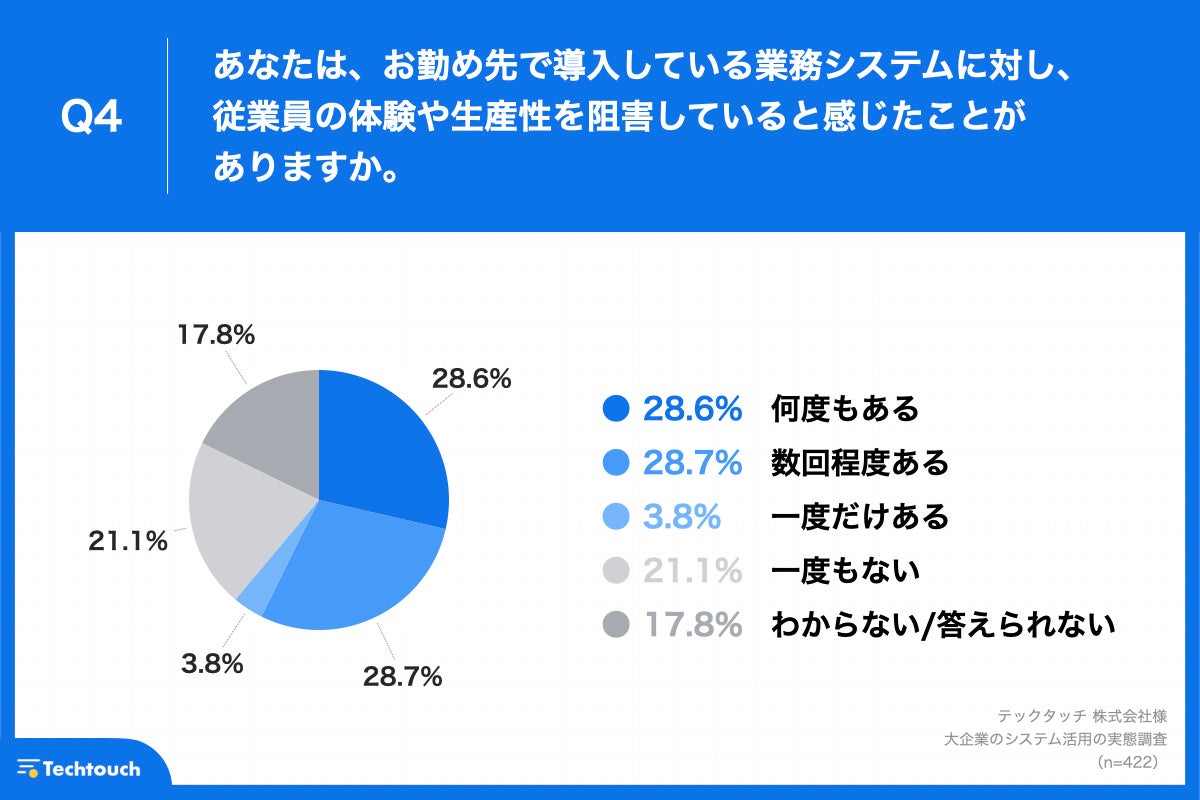 「Q4.あなたは、お勤め先で導入している業務システムに対し、従業員の体験や生産性を阻害していると感じたことがありますか。」(n=422)と質問したところ、「何度もある」が28.6%、「数回程度ある」が28.7%という回答となりました。