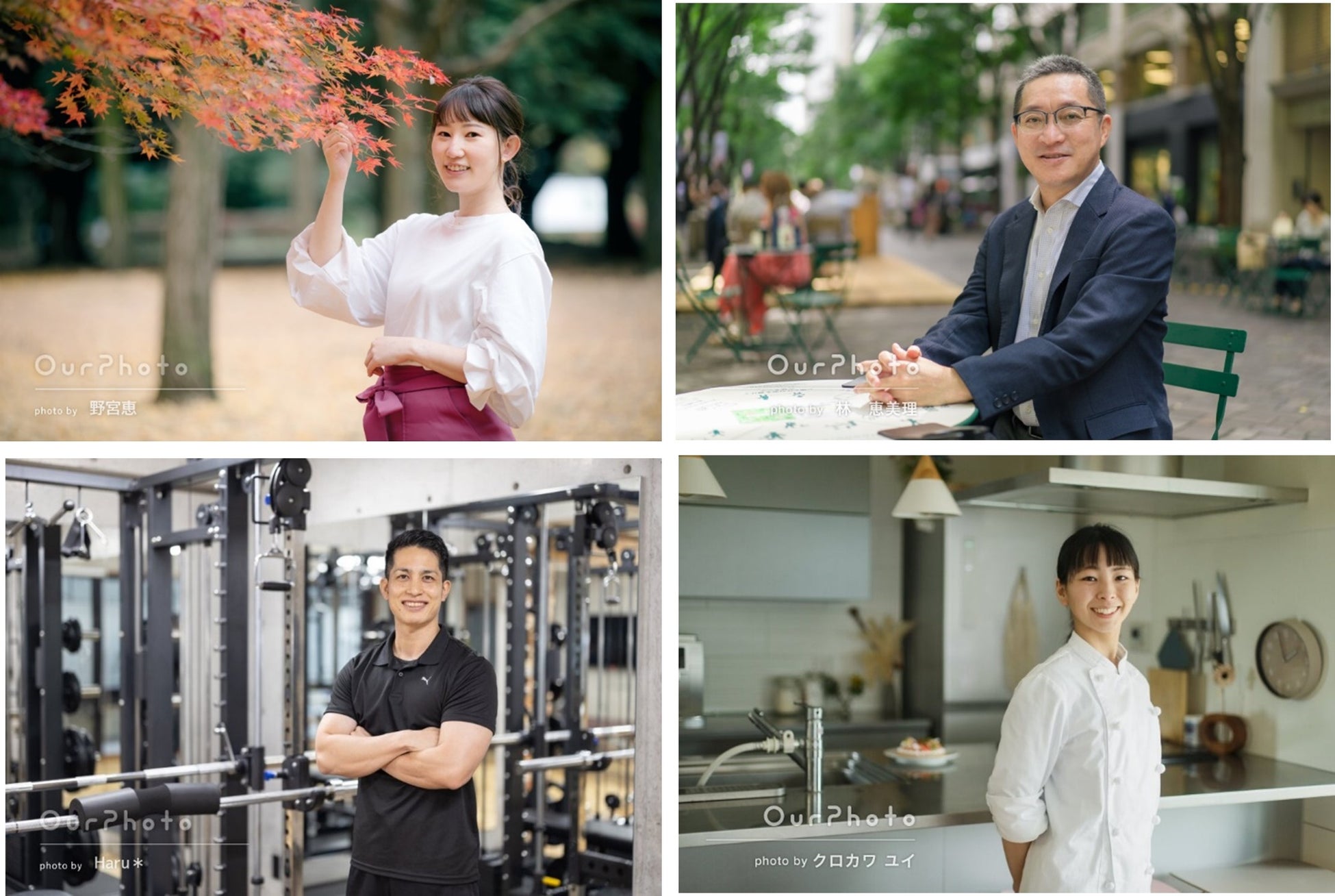 OurPhotoの中でも人気の撮影ジャンルである「プロフィール」写真の撮影は、お気に入りのロケーションや好きな服装、さまざまなポーズで自分らしさを表現でき、魅力を最大限に引き出せることが特徴です。撮影したプロフィール写真は、会社ホームページのプロフィールや名刺、オウンドメディアの記事画像、副業や個人事業ビジネスのウェブサイトなどのビジネスシーンはもちろん、SNSやマッチングアプリ、婚活サイト、結婚相談所に登録する写真などにも多くの方に使用いただいています。また他にも、誕生日や一人旅など自身の記念や、就活のエントリーシート貼付用(自己PR写真)、生前遺影撮影、ソロウェディング、モデル・俳優・アーティストの宣材写真など、さまざまなニーズに合わせて撮影できます。