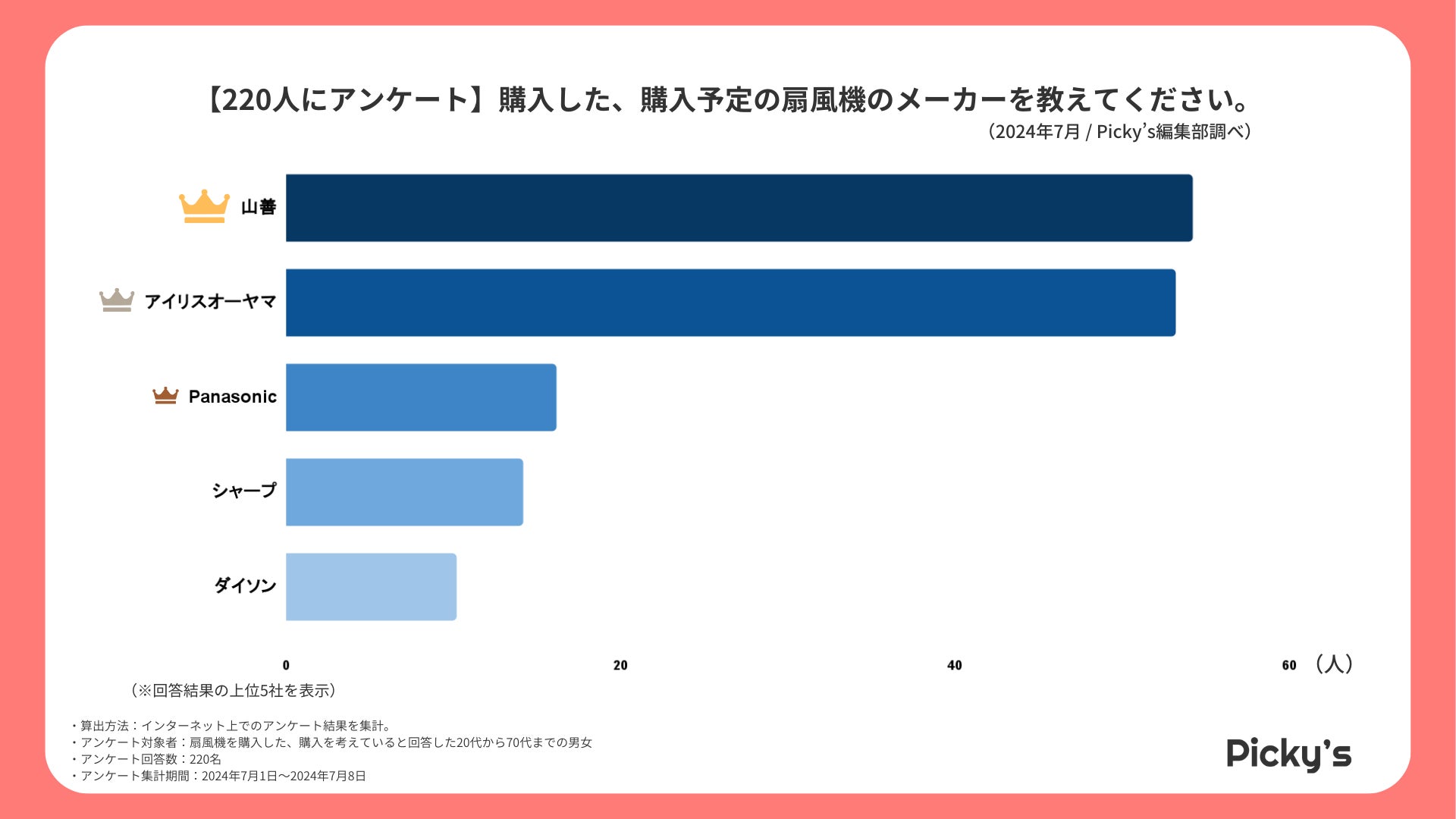 「Picky’s」は、インターネットショッピングにおいて、購入前に試せない・選ぶべきものがわからないという課題の解決を目標に、あらゆる商品のおすすめランキングや検証レビューを紹介するサイトです。このたびPicky’s(https://rentry.jp/)では、夏需要に先駆けて、扇風機についてインターネット上でアンケート調査を行いましたので発表いたします。