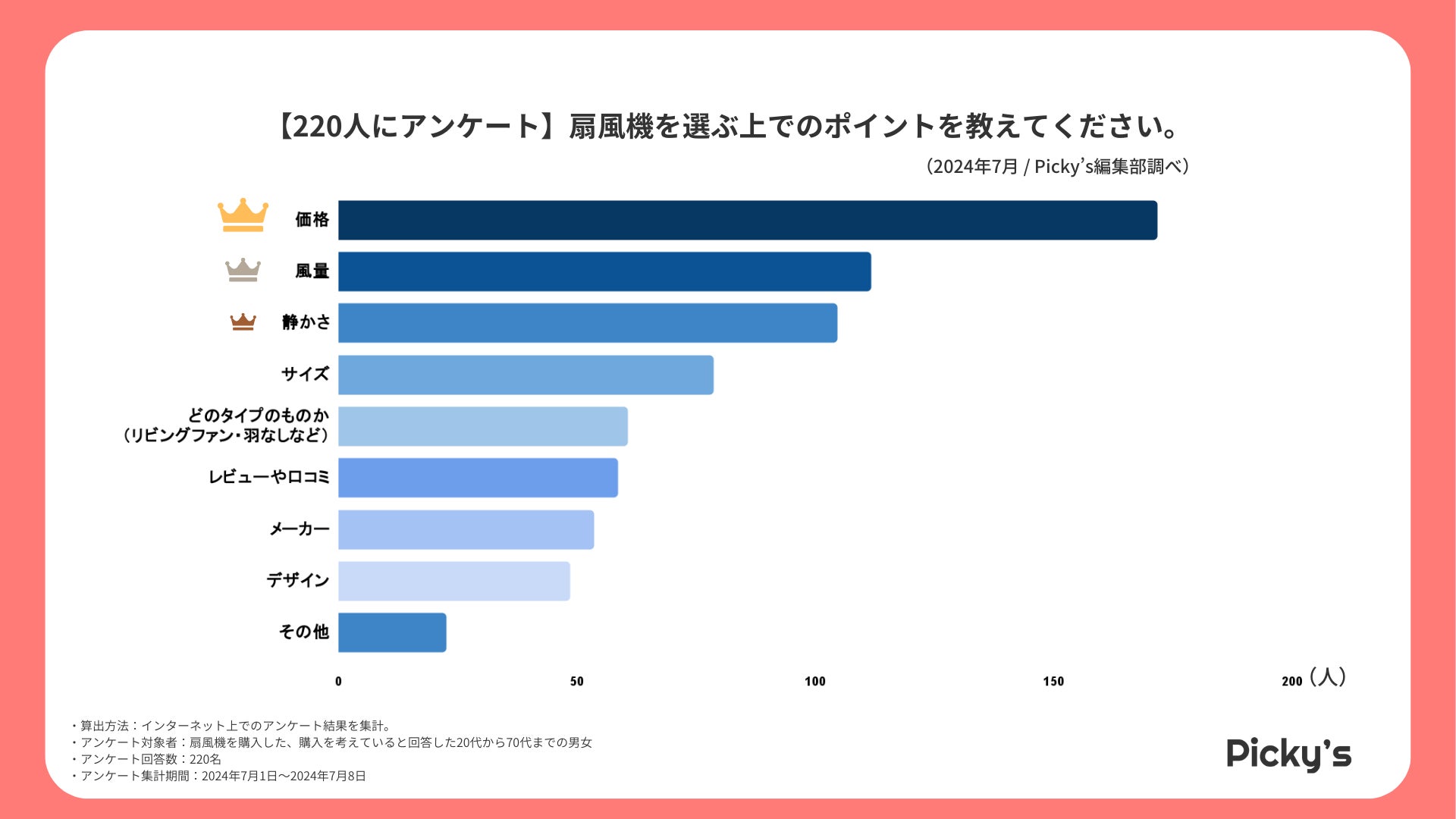 アンケート結果によると、扇風機を選ぶ上で最も重要視されているポイントは「価格」(171票)です。