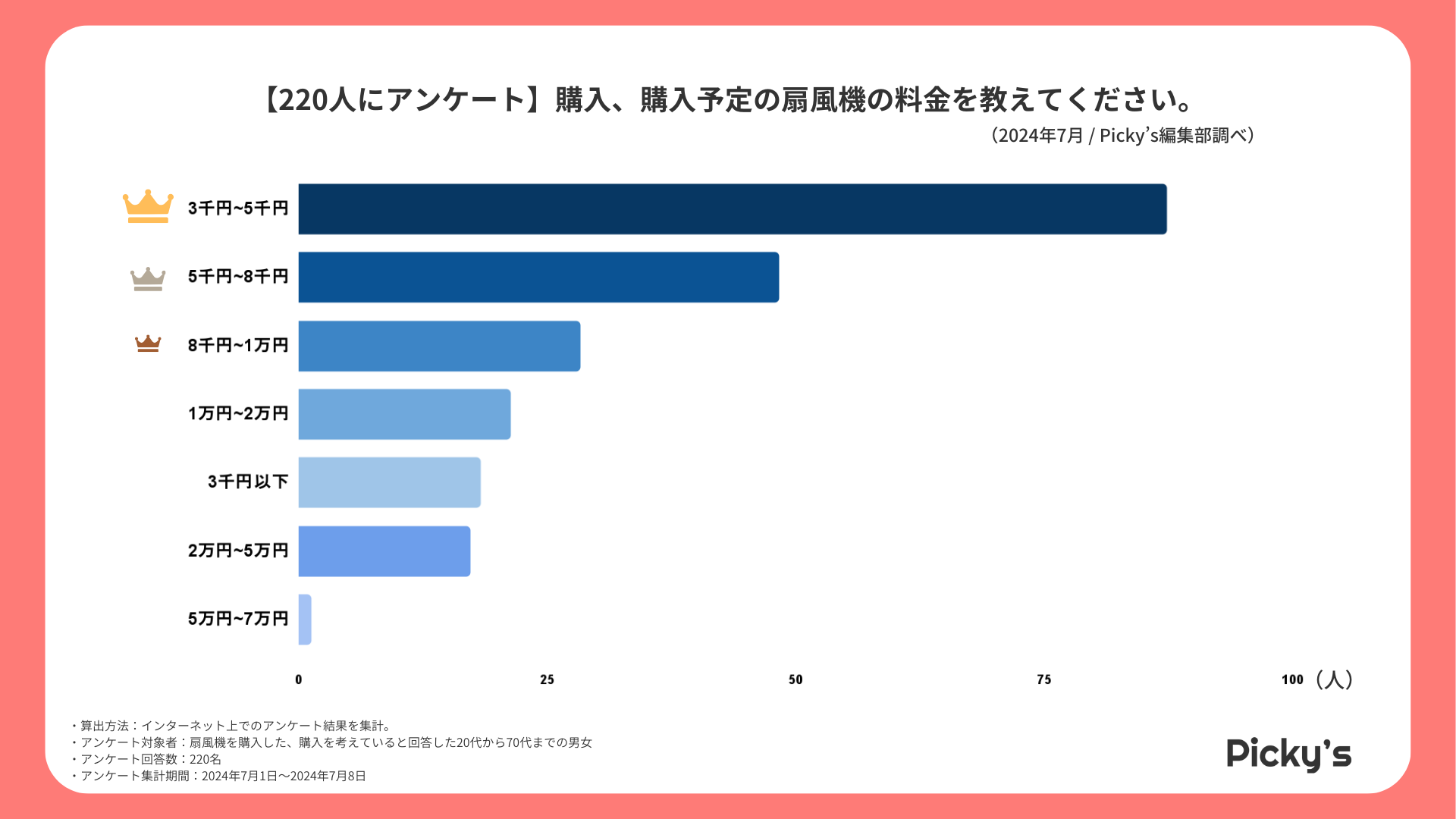 購入、購入予定の扇風機の料金は「3千円~5千円」が最も多く(87票)、次に「5千円~8千円」(48票)という結果になりました。多くの消費者が比較的手頃な価格帯の扇風機を選んでいることがわかります。