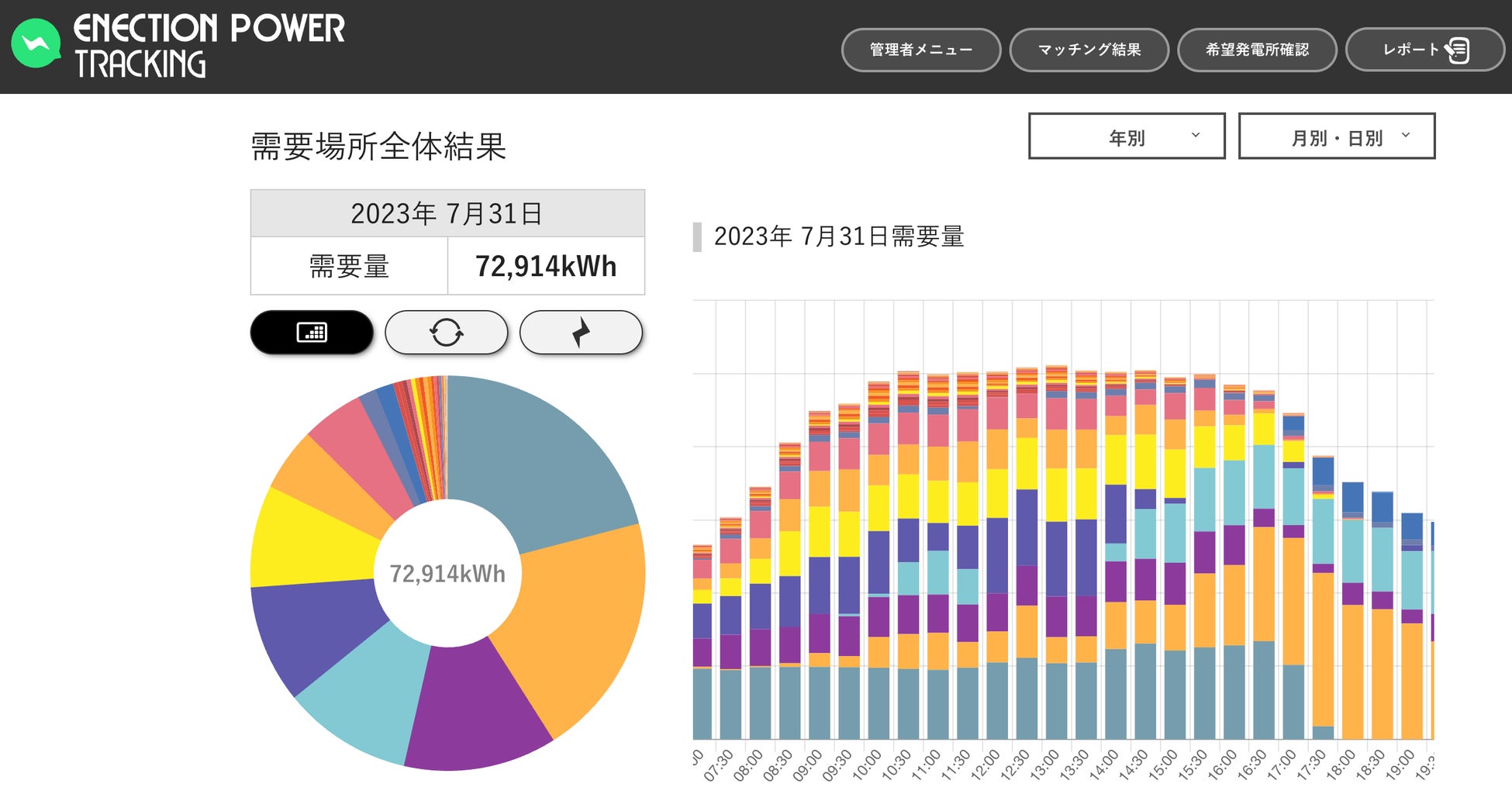 生産者の顔やストーリーを開示した「顔の見える電力」として、全国約1000の発電所から電力を調達し、再生可能エネルギー100%* の電力を供給しています。また、2018年には発電量と需要量を30分ごとにマッチングし、ブロックチェーンを使って「どの電源からどれだけ電気を買ったか」を証明するP2P電力トラッキングシステム「ENECTION2.0」を法人向けに商用化しました。これにより、ブロックチェーンで電源を指定した電力購入を可能にしています。