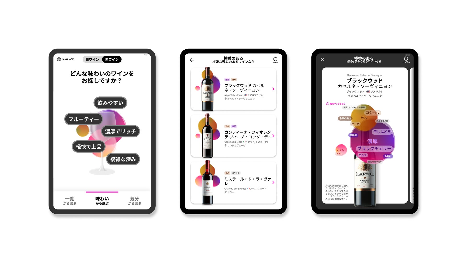 一方、特別設置となる築地東劇ビル店、アークヒルズフロントタワー店の2店舗では、KAORIUM設置に加え、セントマティックがワインの演出企画と商品選定までをトータルでプロデュースします。この特別設置店舗では、KAORIUM独自の風味マップを店舗に設置することで、お客様が直感的にワインを選べる仕組みを導入します。また、表示されるワインの数を他4店舗よりも絞り込むことで、選択肢の多さによる迷いを解消し、お客様の探しやすさの向上につなげていきます。