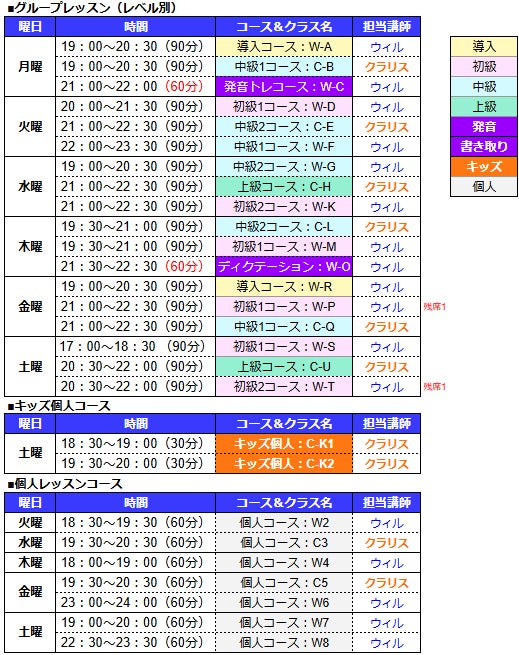 *レッスンは週1回。時間はいずれも日本時間。