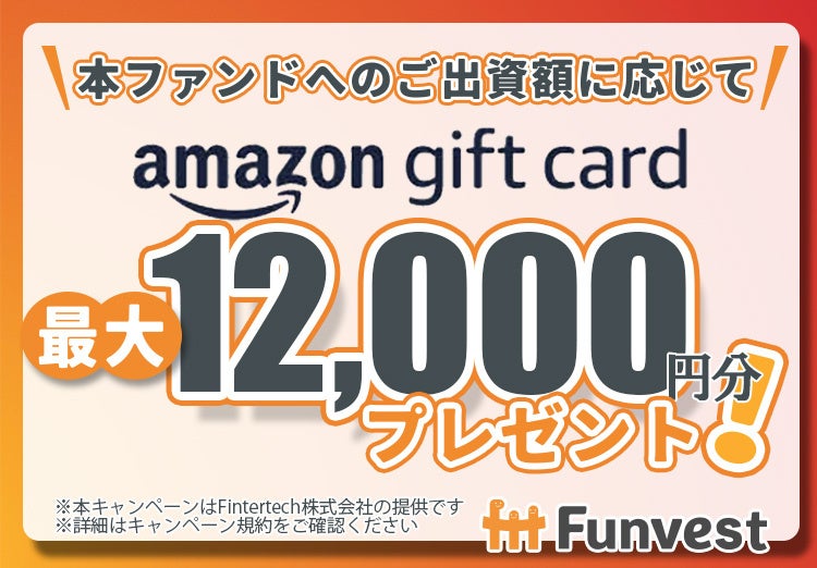 本ファンドへ出資していただいた投資家の皆様を対象として、出資額に応じて最大12,000円分のAmazonギフトカードをプレゼントするキャンペーンも併せて実施いたします。