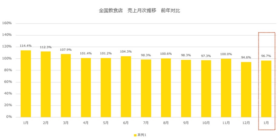 1月度の前年対比の売り上げ伸長率は、前月から2.1pt増加した。売り上げは前年対比96.7%で、マイナスとなった。