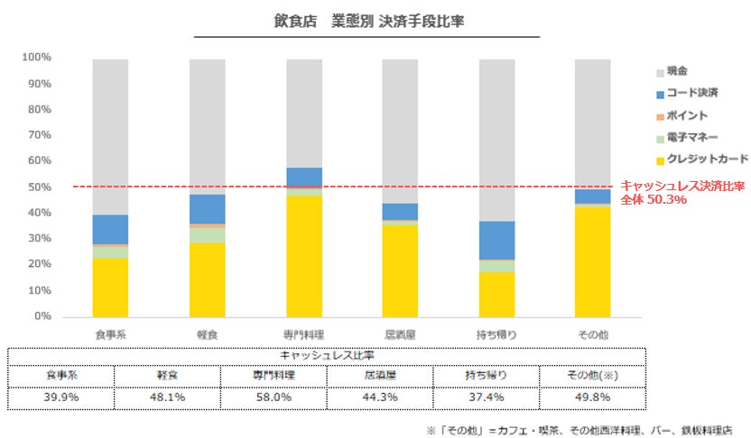 業態別のキャッシュレス比率は、すべての業態で35%を超える。