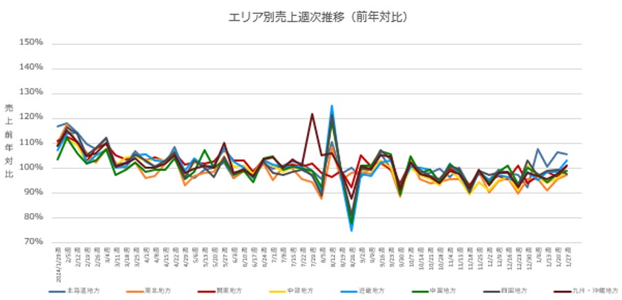 地域別では、北海道地方が最も高く前年対比105.2%となった。
