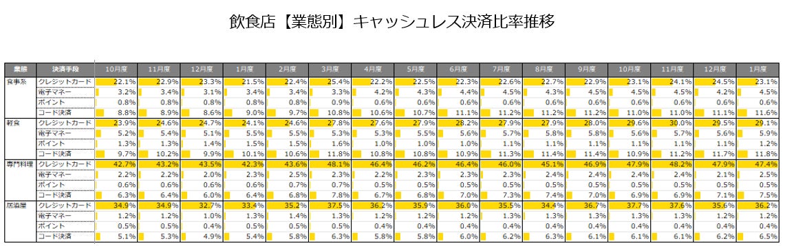 キャッシュレス決済比率は、食事系・持ち帰り以外の業態で12月度から1月度にかけて増加した。専門料理は58.0%と業態の中で一番比率が高い。また、12月度から1月度にかけて、すべての業態でコード決済比率が増加した。