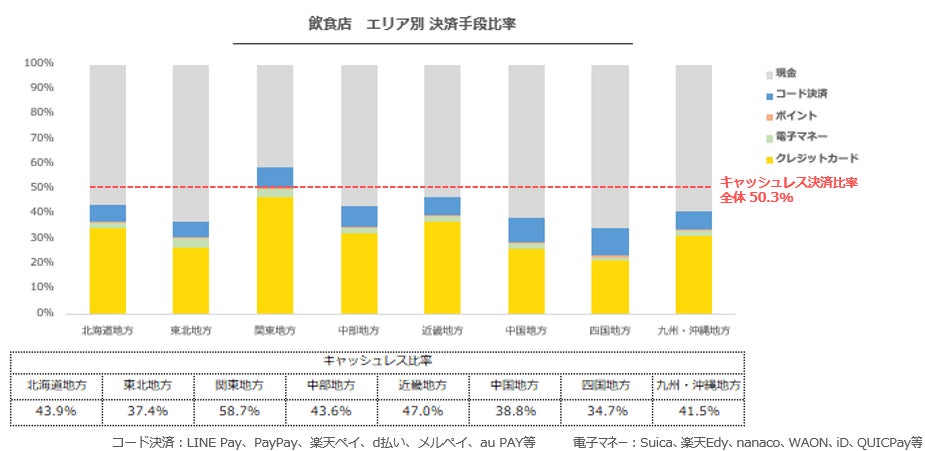 キャッシュレス決済比率が最も高い関東地方は58.7%で、前月から0.3%減少した。