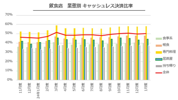キャッシュレス決済比率は12月度から1月度にかけて、食事系・持ち帰り以外の業態で増加した