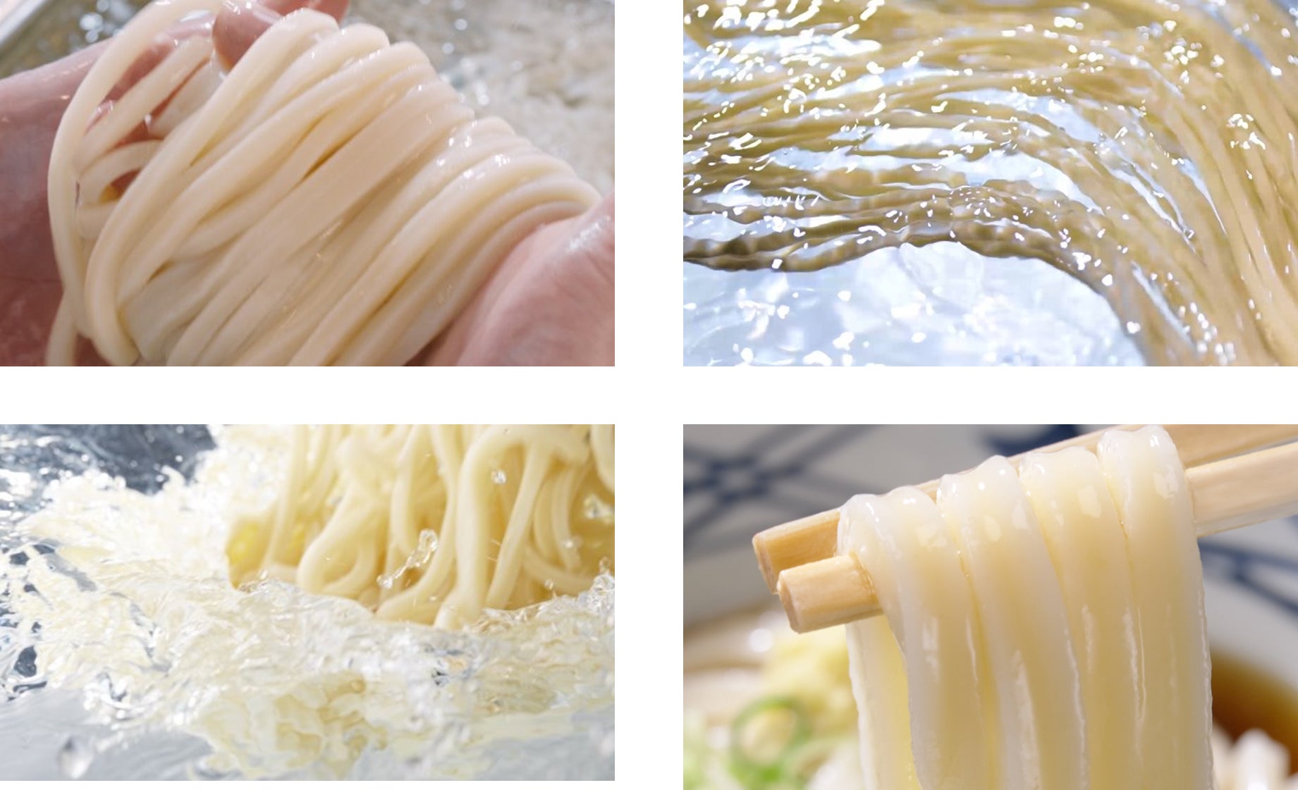 茹で上がり後、水でしっかりと麺を締めることで、口に入れた瞬間からつるつると滑らかな口あたりで、のど越しの良いうどんになります。噛んだ瞬間にもちっと心地よいコシをご堪能いただけます。