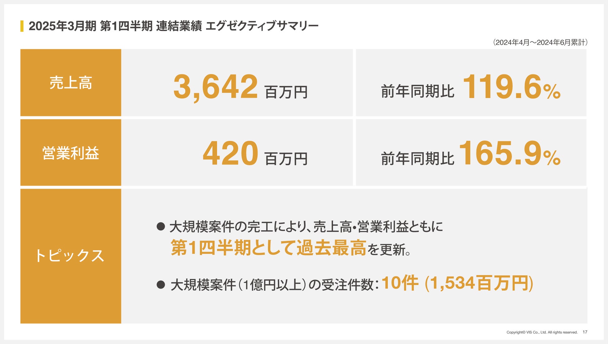 ・大規模案件の完工により、売上高・営業利益ともに第1四半期として過去最高を更新しました。
