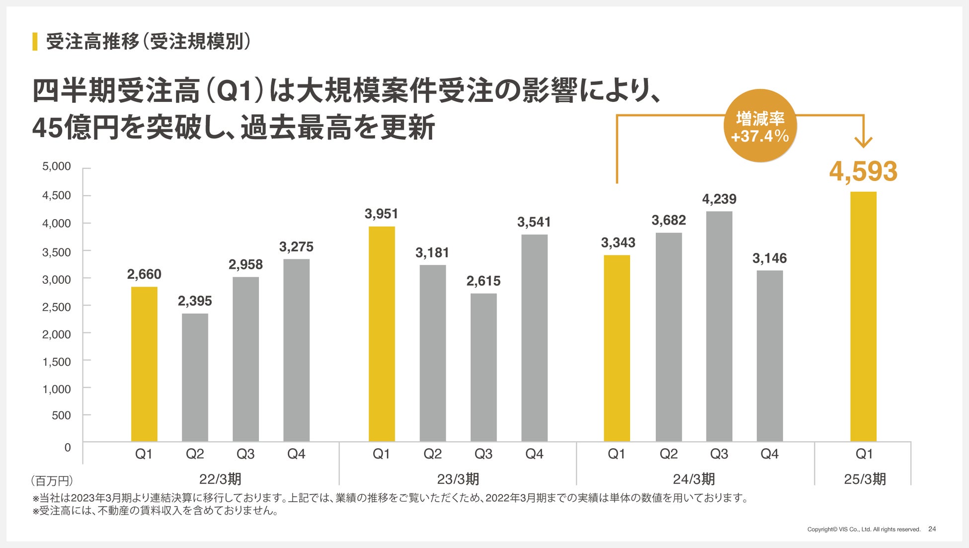 第1四半期の受注高は、大規模案件の受注の影響により、45億円を突破し、過去最高を更新しました。