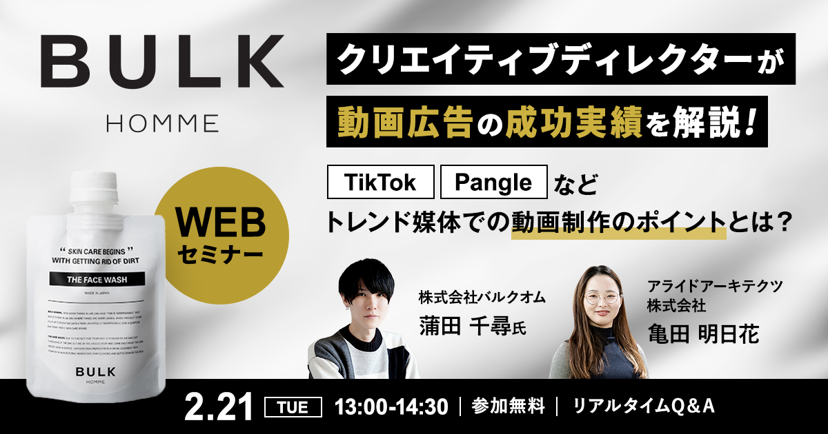 企業のマーケティングDXを支援するアライドアーキテクツ株式会社(東京都渋谷区、代表取締役社長 CEO:中村壮秀、証券コード:6081)でSaaS事業を展開するプロダクトカンパニー(プレジデント:村岡弥真人)が提供する「運用型制作(※1)」特化型動画制作支援サービス「LetroStudio(レトロスタジオ)」は、メンズスキンケアブランド「BULK HOMME(バルクオム)」の動画広告クリエイティブディレクターを迎えて「トレンド媒体での動画制作のポイントとは?」をテーマに、TikTok・Pangleなどの成功実績を解説するWEBセミナーを2月21日(火)に開催します。