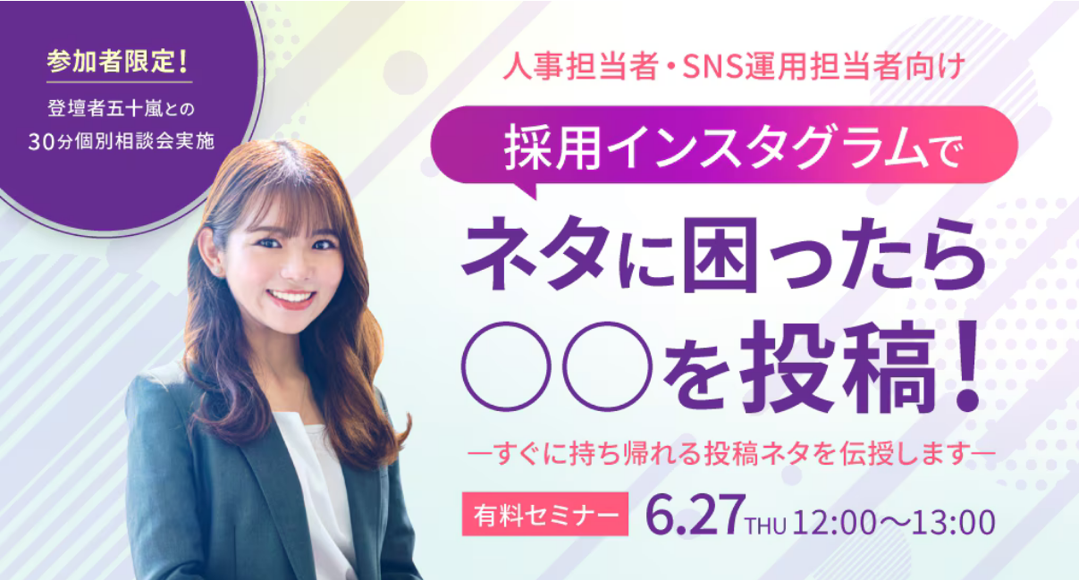 本セミナーでは、Instagramで新卒・中途採用アカウントを"自社内で"運用している企業向けに、求職者が求める【ネタづくり】=コンテンツの組み立て方について解説します。